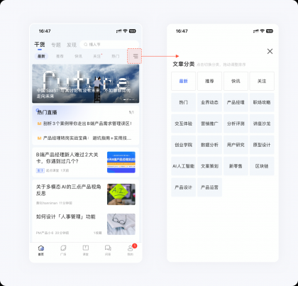 在頁面細(xì)節(jié)元素設(shè)計(jì)上,將角標(biāo)樣式優(yōu)化為右側(cè)的書簽的樣式,整體感受更像現(xiàn)實(shí)生活中的書簽。在輔助標(biāo)簽的設(shè)計(jì)上,將純文字樣式優(yōu)化為右側(cè)這種多彩面型的樣式,強(qiáng)化內(nèi)容的豐富和多元。