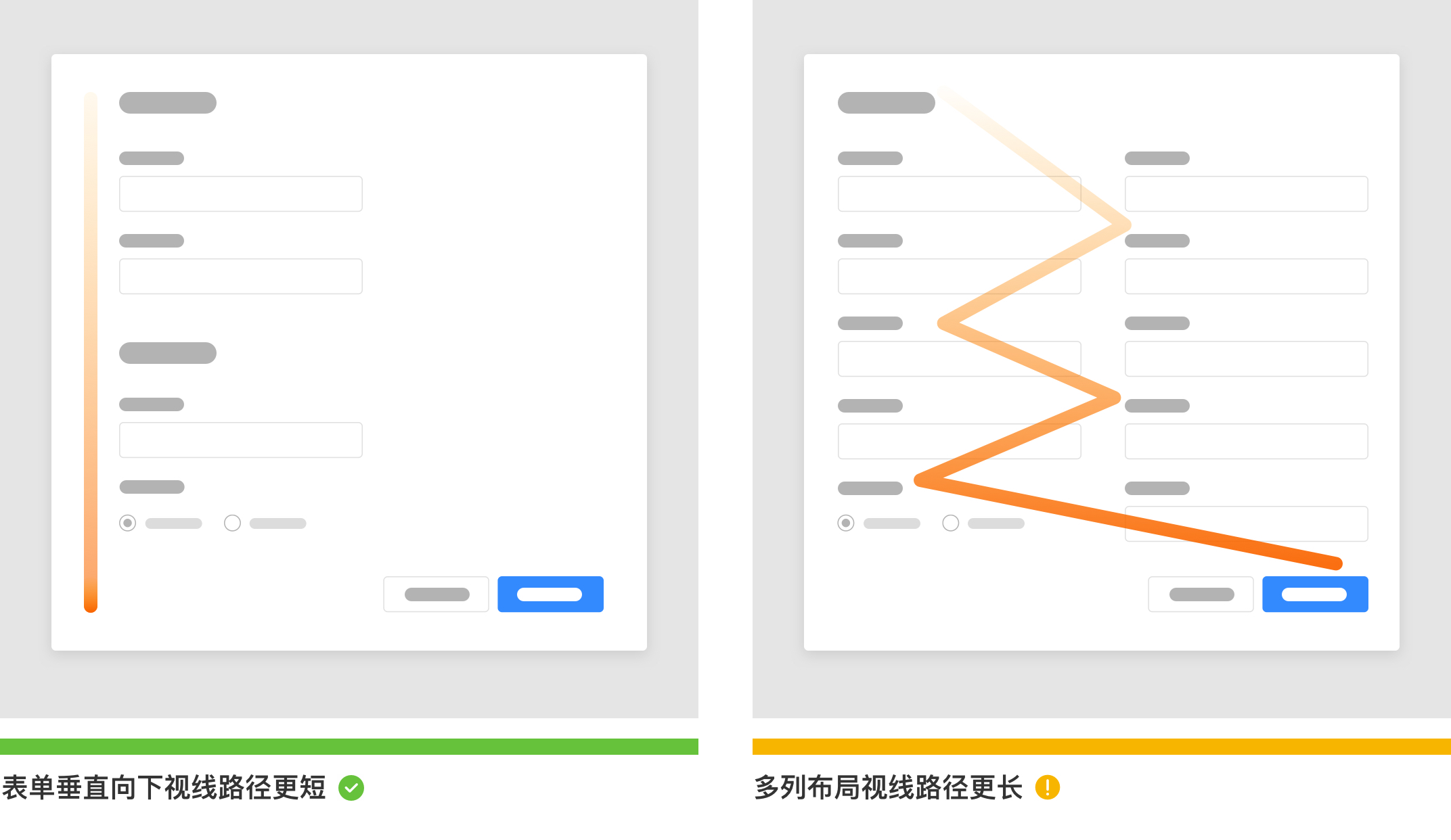 如果表單使用單列,則完成的路徑是頁面垂直向下的一條直線,單列布局能夠給用戶呈現(xiàn)一條清晰的視覺路。因此,表單較為簡單時盡量避免將表單分成多列,在業(yè)務(wù)場景允許的情況盡量使用單列(部分業(yè)務(wù)訴求和一些特定場景要求,多列布局會更節(jié)省垂直空間,但是多列布局需要考慮字段之間的關(guān)聯(lián)性,這里不強求一定只能使用單列布局)。
