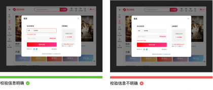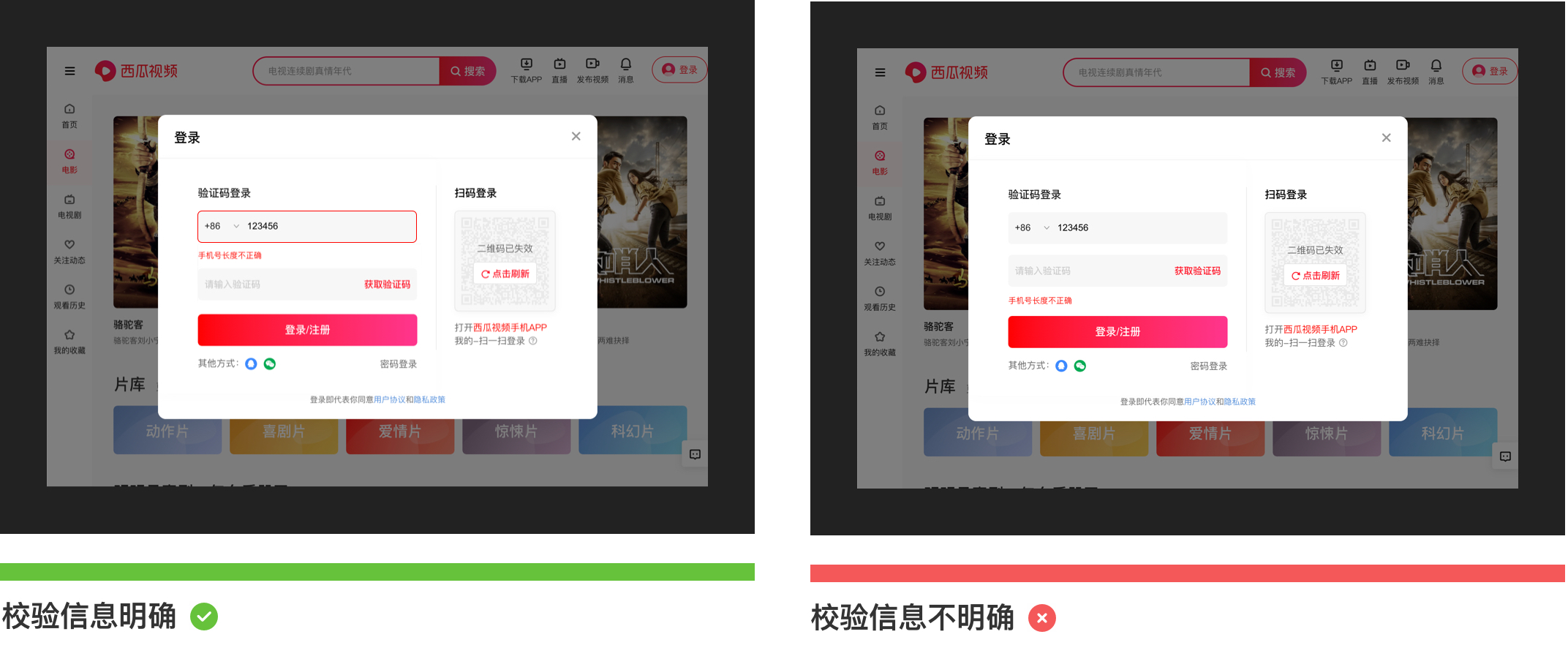 錯誤校驗提示一般存在于錯誤率較高情況下出現(xiàn),如:在登錄注冊時,要求用戶填寫手機號,如果用戶輸入的手機號碼不符合特定的輸入格式,那么這時候需要明確標(biāo)記錯誤原因,準(zhǔn)確的幫助用戶找到問題并解決,避免錯誤提示描述模糊不清誤導(dǎo)用戶。錯誤提示一般會采用“雙重視覺強調(diào)”來顯示錯誤,除了輸入框突出顯示外,同時需要在輸入框下方加入紅色指導(dǎo)文字。如下圖所示為西瓜視頻登錄注冊場景下的截圖: