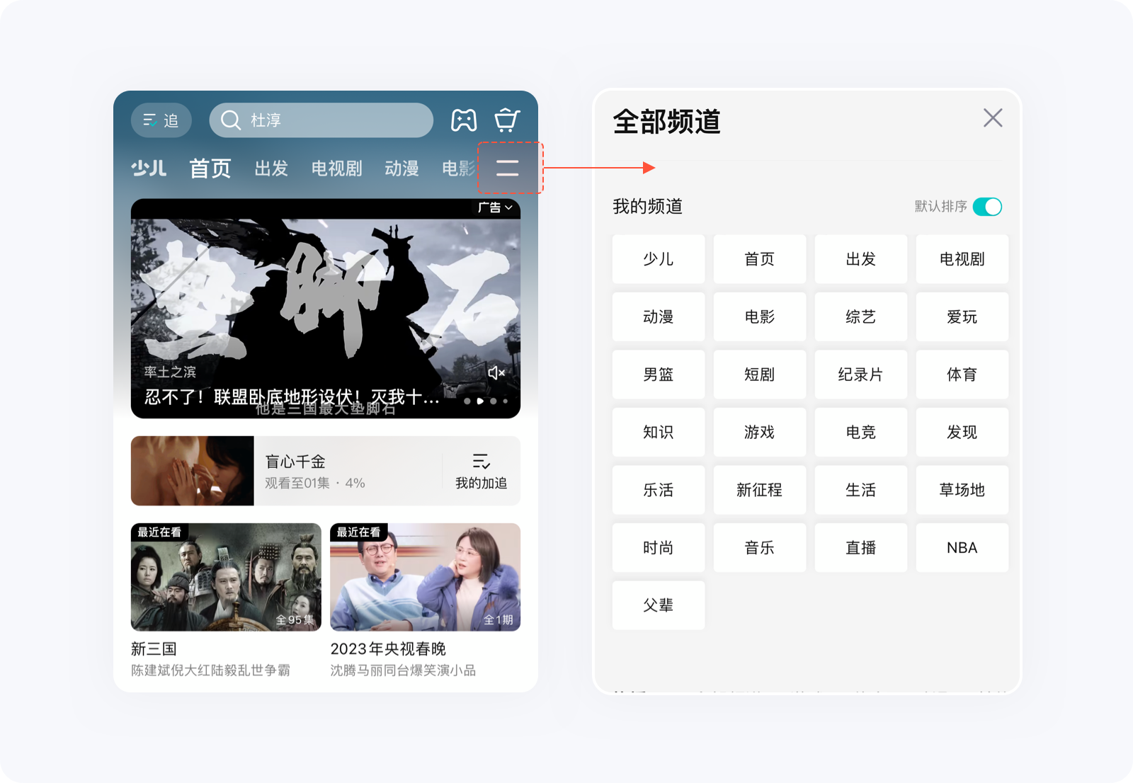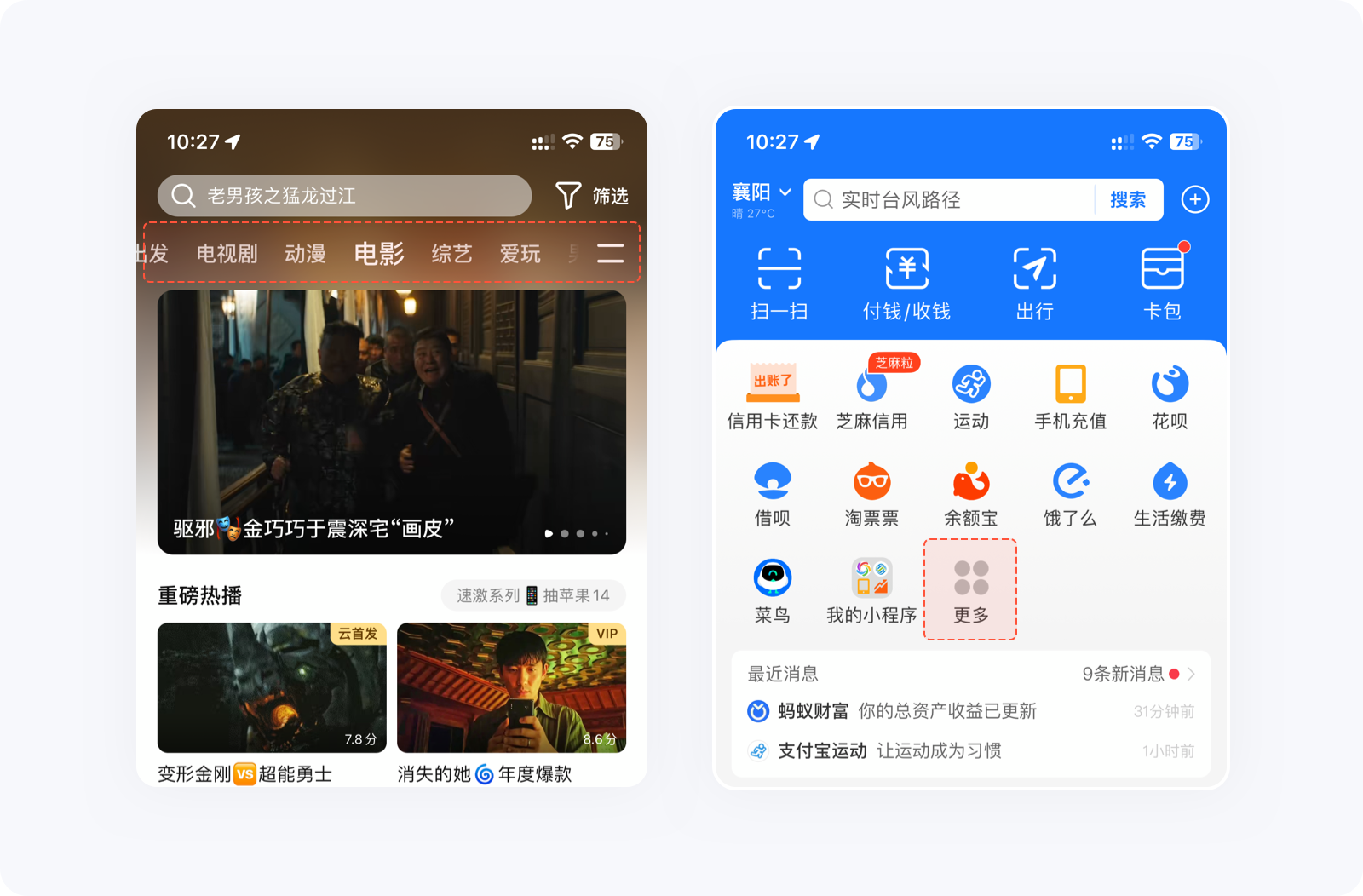 如果大量的選項無法減少,可將重要選項靠前,將其他的隱藏起來,方便用戶決策及降低失誤操作的概率。例如騰訊視頻頂部分類后面的更多圖標(biāo)、支付寶首頁金剛區(qū)的更多入口,點開后就會發(fā)現(xiàn),里面隱藏了非常多的功能,這樣做能減少用戶認(rèn)知負(fù)荷,提高信息篩選的效率。