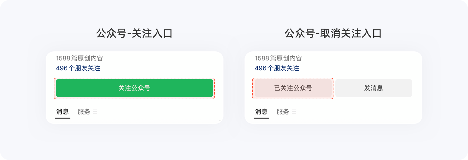 有時候,出于商業(yè)化的目的,同一個選項在二次操作時,產(chǎn)品會刻意增加用戶操作成本,以降低選擇效率,看似??硕傻姆聪虿僮?,卻一定程度地降低了用戶退出率,實則對產(chǎn)品有益。例如,在關(guān)注微信公眾號之前,非常醒目的關(guān)注按鈕觸手可及,可關(guān)注之后,弱化的幽靈按鈕及文案,很難一眼看出這就是取消關(guān)注入口,需要用戶花費額外的時間去理解或試錯方可取關(guān),這么做能降低公眾號粉絲的取關(guān)量。為公眾號留住粉絲,更是對內(nèi)容認(rèn)可的一種支持,后面的良性循環(huán)無需多講。
