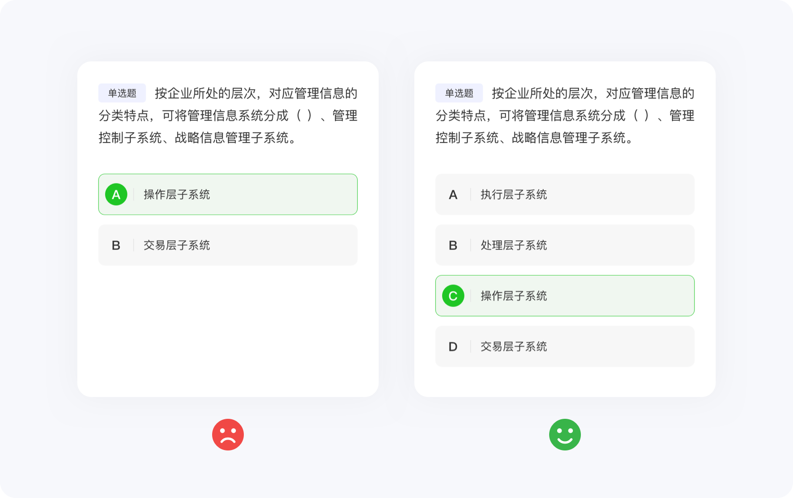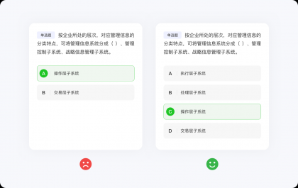 任何定律都有其自身的使用局限,所以也不要極度推崇??硕啥喕匠橄蟮牡夭?。大部分情況下,??硕啥际怯迷诳山换ソ缑嬷械脑?,對于那些需要高度搜索、閱讀或?qū)W習(xí)刷題類的功能并不適用,因為設(shè)計師只能決定信息呈現(xiàn)的視覺效果,并不能決定內(nèi)容的質(zhì)量、類型與數(shù)量。例如,刷題類應(yīng)用,面對海量的選擇題,??硕呻m然失去價值,但并不影響設(shè)計師結(jié)合其他方法論將界面設(shè)計的更好,總不能強行使用??硕桑瑢⑦x擇題刪減到只剩兩個(變成判斷題)選項吧。