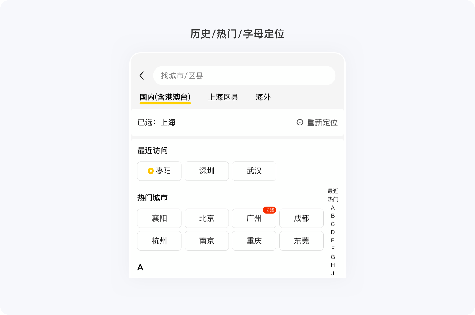 另外,我們在選擇地址時,如果將所有城市一股腦平鋪在界面上,用戶想要選擇自身所需,則需要花費大量的時間。對城市進(jìn)行了分類分層,以及有了搜索歷史、熱門城市以及右側(cè)的首字母索引后,用戶就能通過不同維度快速找到想找的城市,選擇效率直線上升。