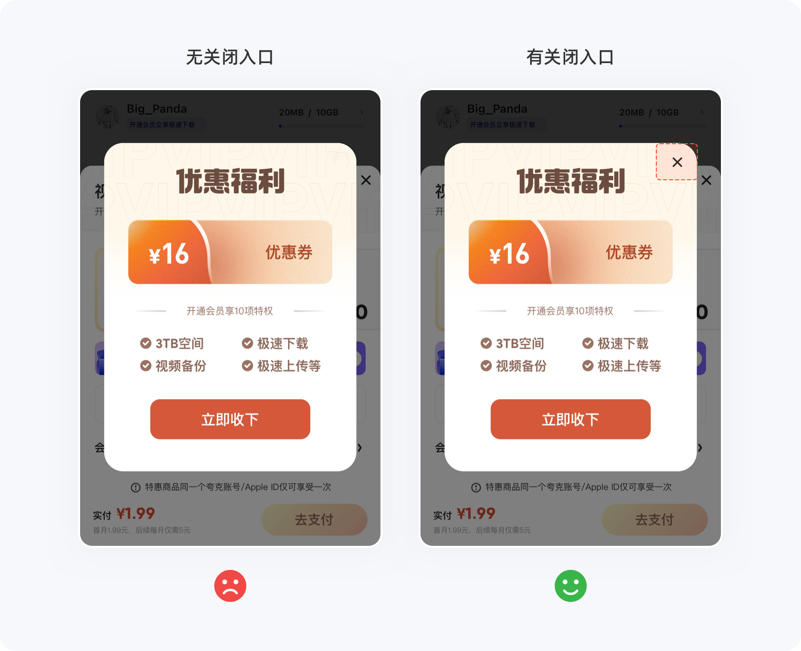 ??硕梢龅氖峭ㄟ^減少用戶做決定的時間,來提升轉(zhuǎn)化率以及用戶體驗,但不管在什么情況下,用戶都希望自己還擁有選擇的權(quán)利,如果設(shè)計師自作聰明的將選項減到只剩一個,就相當(dāng)于告知用戶必須接受,那么用戶就有種被強制、綁架的感覺,只會存在兩個結(jié)果:①被你的產(chǎn)品拿捏、②離開你的產(chǎn)品,筆者相信第一種可能性的概率極低,畢竟同類型的產(chǎn)品并不是只有你一家(壟斷除外)。如下圖的彈窗,用戶即便不愿意進(jìn)入任務(wù)流程,可別無選擇,只能進(jìn)入后再返回才能回到原位,這種做法無端增加用戶的操作成本,極易引起反感情緒。不管產(chǎn)品如何希望用戶轉(zhuǎn)化,切不可強制他們接受,需要給用戶留一條返回的“路”,即便不那么起眼,至少還有選擇的權(quán)利。