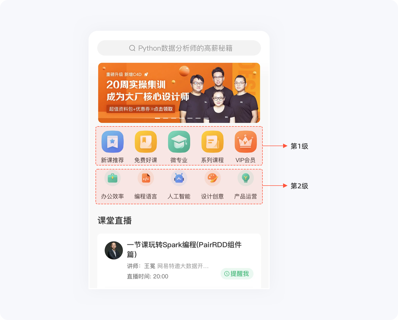 在設(shè)計過程中,如果沒有對功能層級進(jìn)行劃分,一股腦地將所有功能入口平鋪的話,就需要用戶花費大量的時間和精力來查找需要的功能,無疑是一場災(zāi)難。我們可以通過??硕蓙韮?yōu)化界面功能布局,根據(jù)業(yè)務(wù)的重要性對功能入口進(jìn)行分類組合,減少用戶的認(rèn)知及理解成本,以便快速達(dá)到目的。