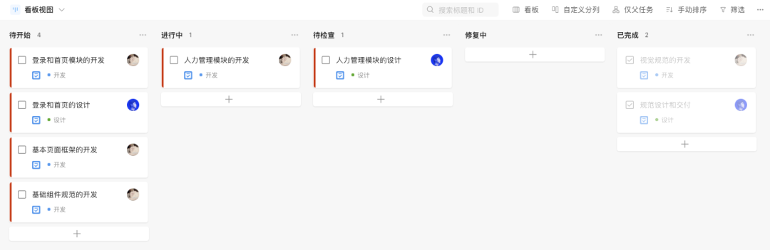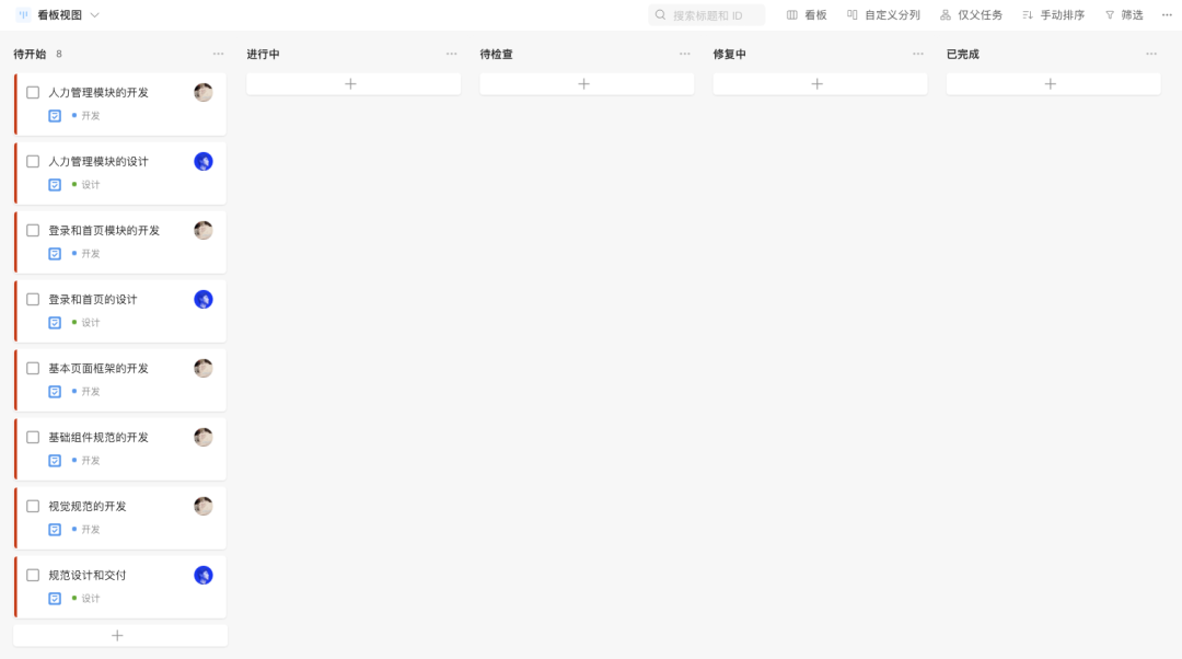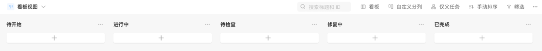 在看板工具中創(chuàng)建待開始、進(jìn)行中、待檢查、修復(fù)中、已完成5個(gè)步驟,然后開始在待開始內(nèi)創(chuàng)建相關(guān)的任務(wù)卡片。