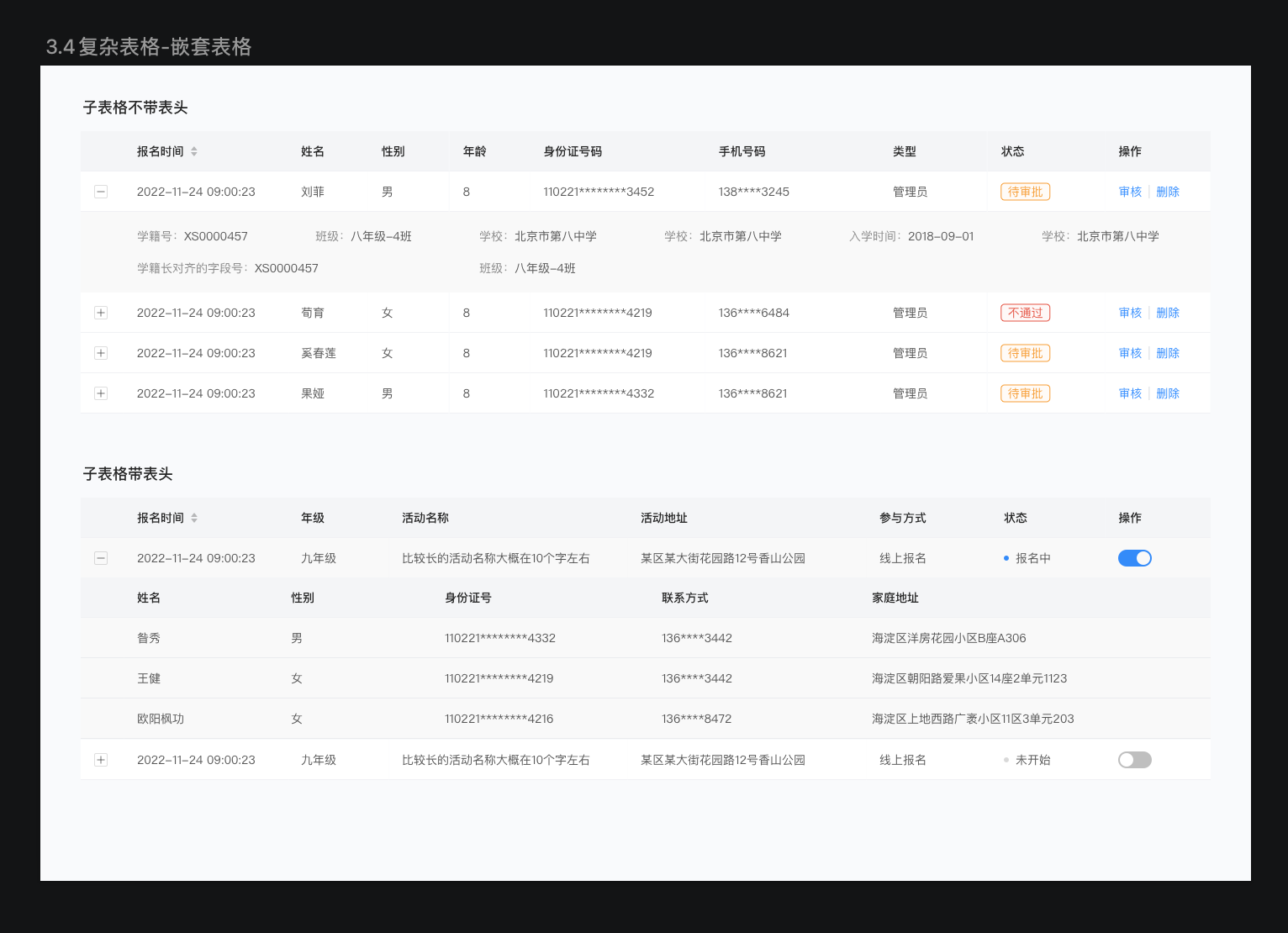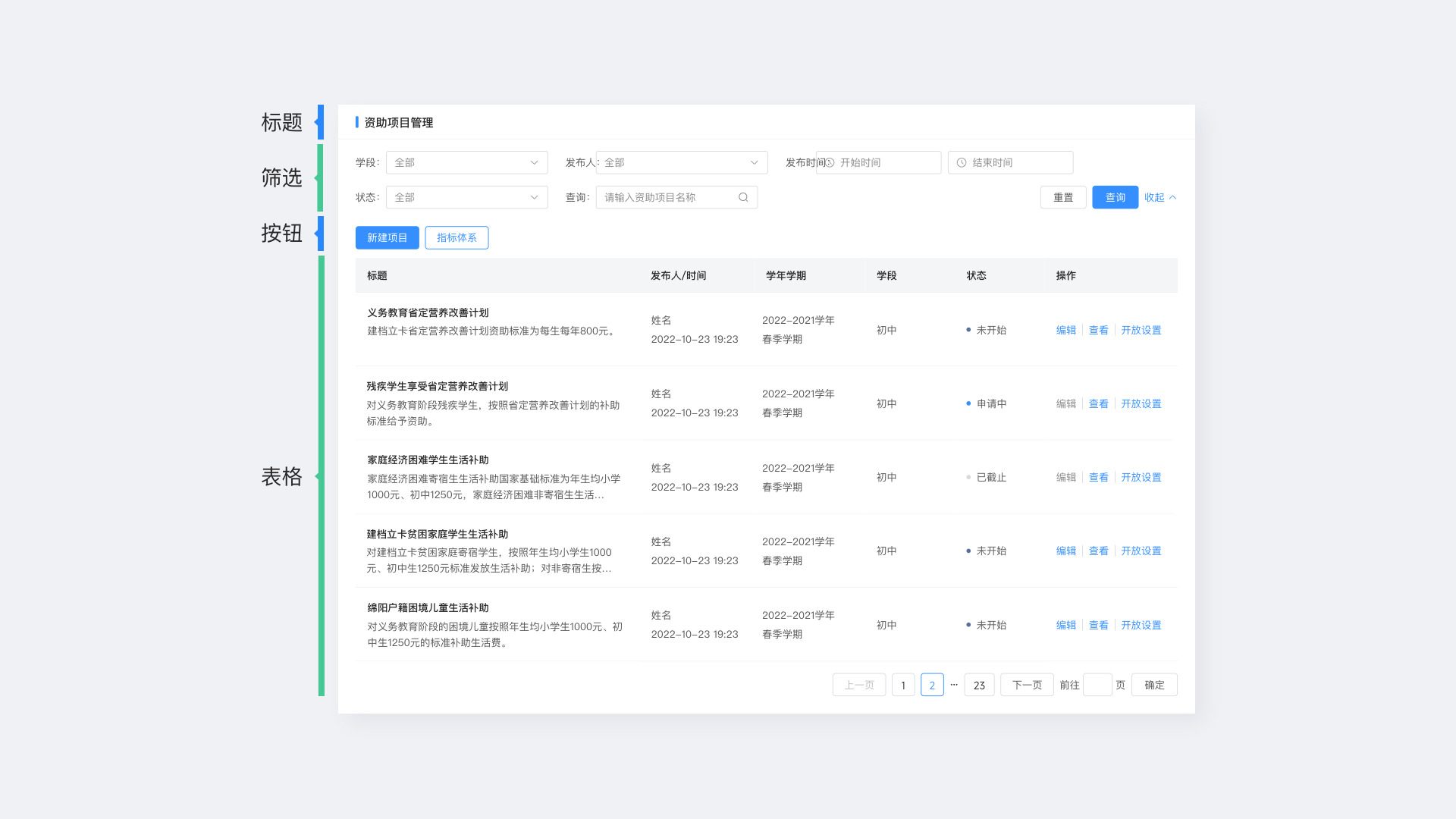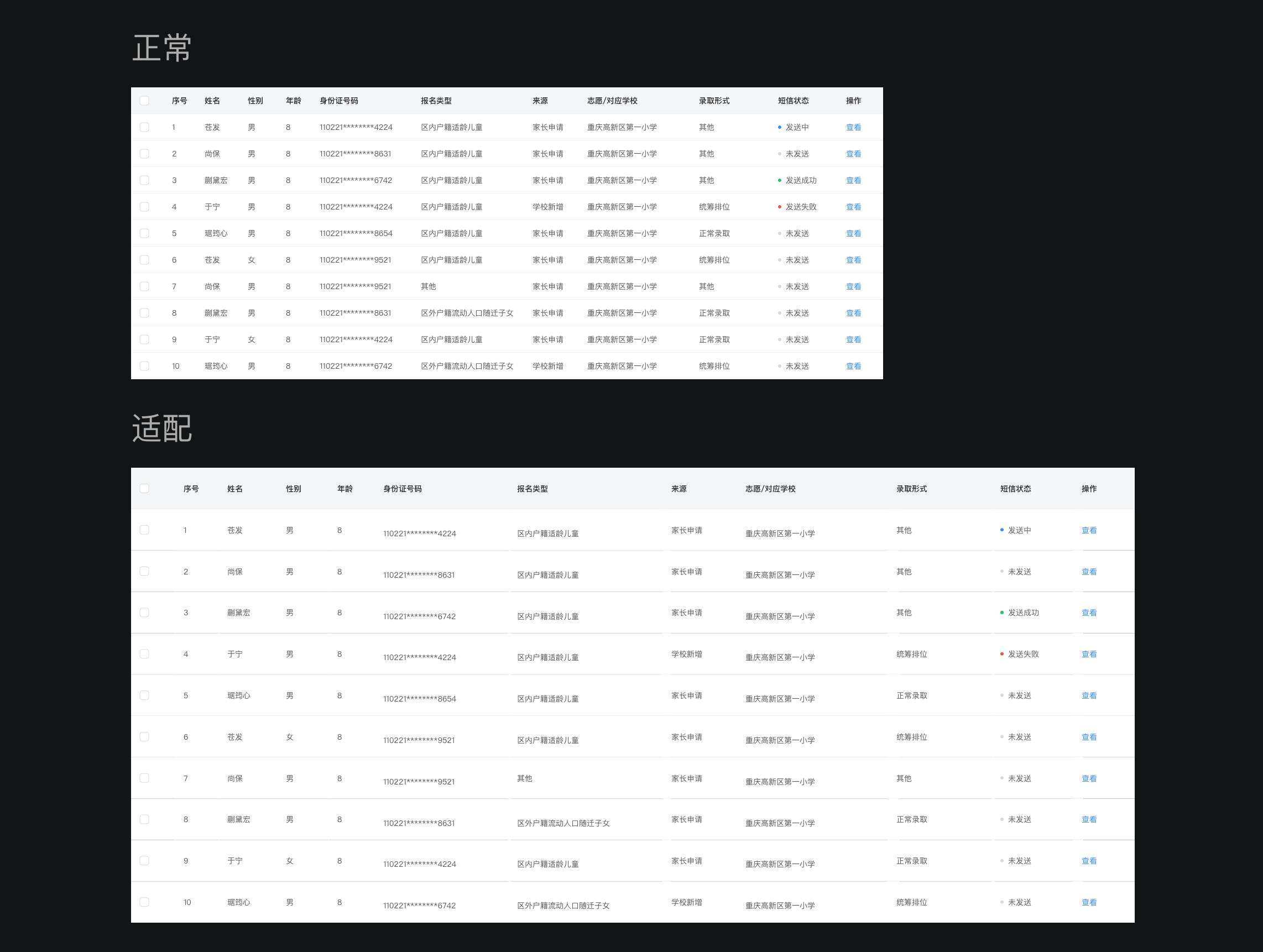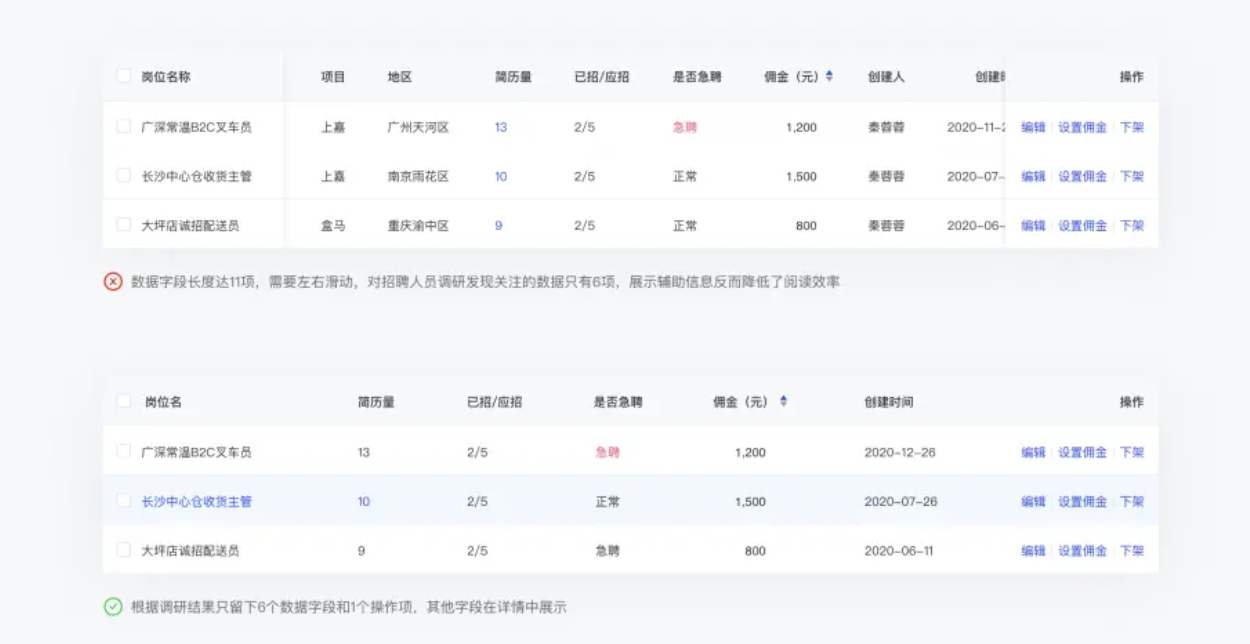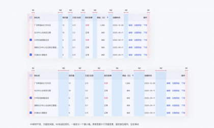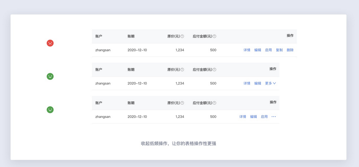 表格設計中一定不要使用過多的顏色區(qū)做狀態(tài)或操作的區(qū)分,過多的顏色細分會使表格變得更加混亂,影響用戶體驗。對狀態(tài)的區(qū)分,僅用輕量的顏色區(qū)分即可,操作欄保持主色按鈕色。