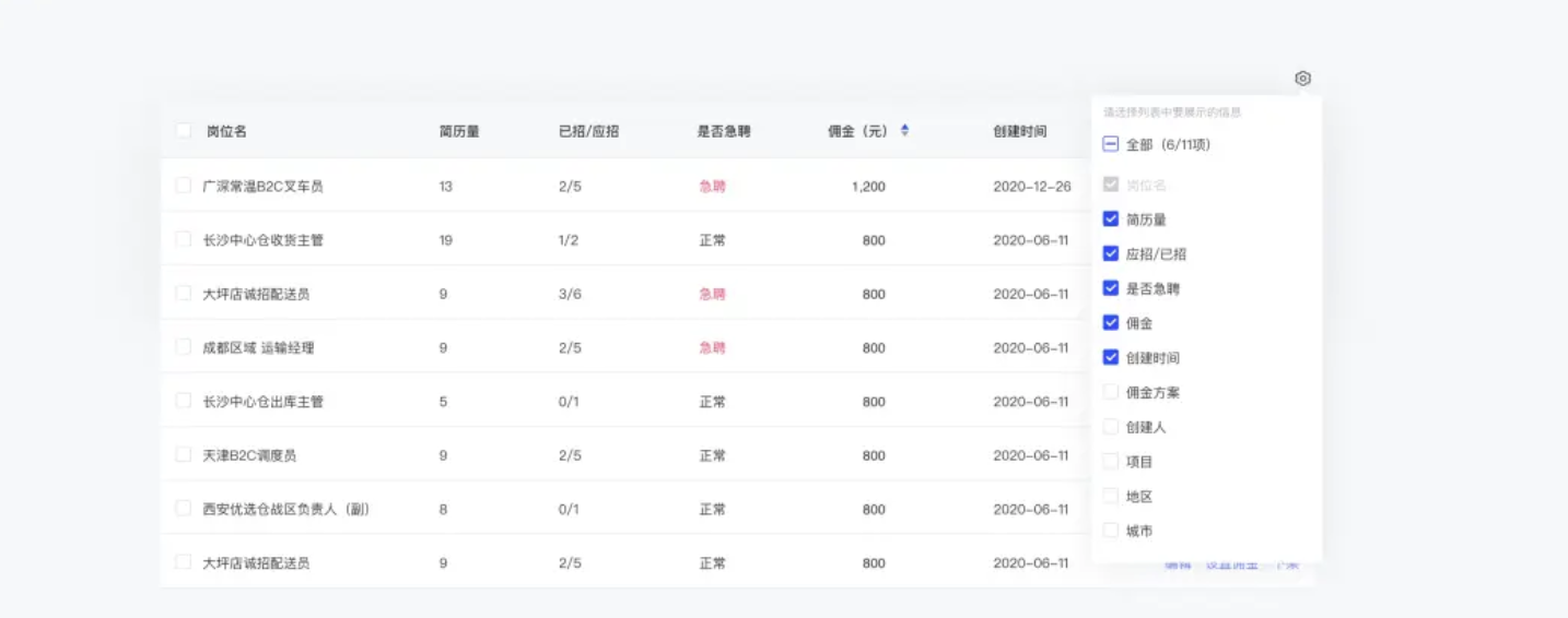 如果不同用戶想看到的信息側重不同,可以讓用戶自定義列的展示。在默認情況下僅展示最常用、最重要的幾個指標(如下圖)。這樣做的好處是:首先,用戶能在表格上方看到所有的指標名稱,避免了原來需要橫向拖拽才能瀏覽到所有指標的情況;其次,用戶可以根據(jù)自己的需要,自由的選擇顯示所需指標,隱藏不必要指標,減少干擾。但需注意系統(tǒng)應記住用戶上一次的自定義列設置,減少用戶重復操作。
