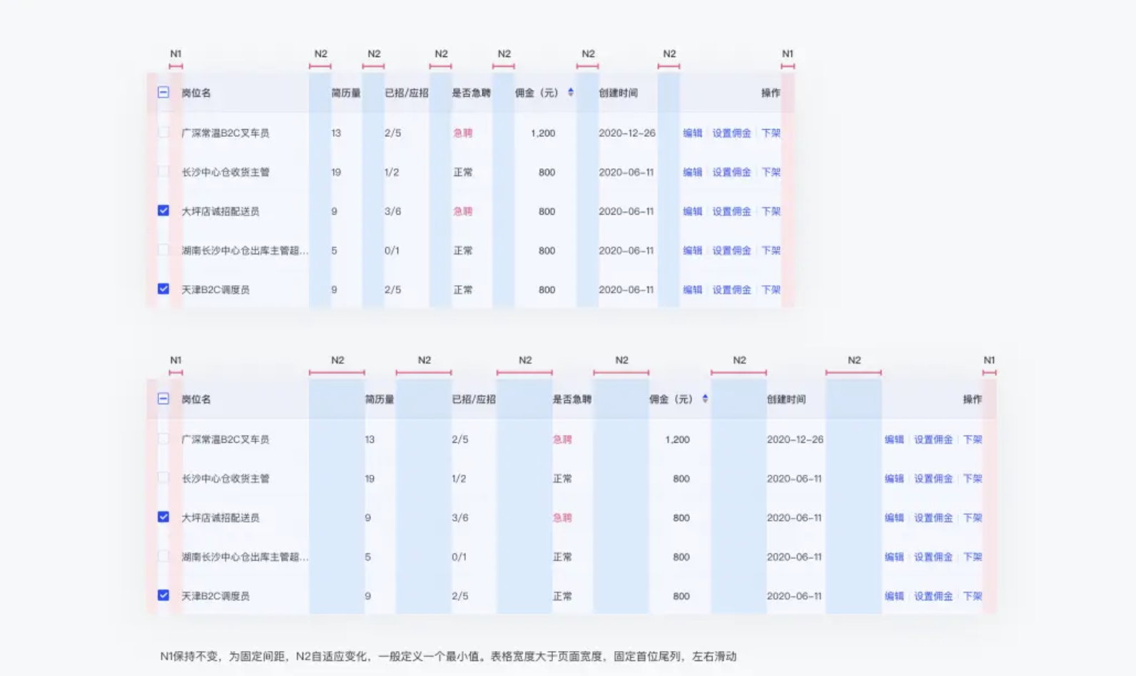 合適的填充和邊距對于視覺設計至關重要,以保證易讀性。定義列的間距時,我通常的做法是N1保持不變,將N2定義一個最小值,N2再根據(jù)表格的寬度自適應變化。表格主要適配到這個最小寬度,這一步驟通常的設計系統(tǒng)的初期就要完成,一方面可根據(jù)自己項目目前情況,按照導航寬度等固定尺寸確定最小的表格寬度,這樣在處理最小尺寸時,可以有一個明確的邊界,同時能與開發(fā)同學進行理解溝通。當表格寬度大于頁面寬度,固定首尾列,左右滑動。