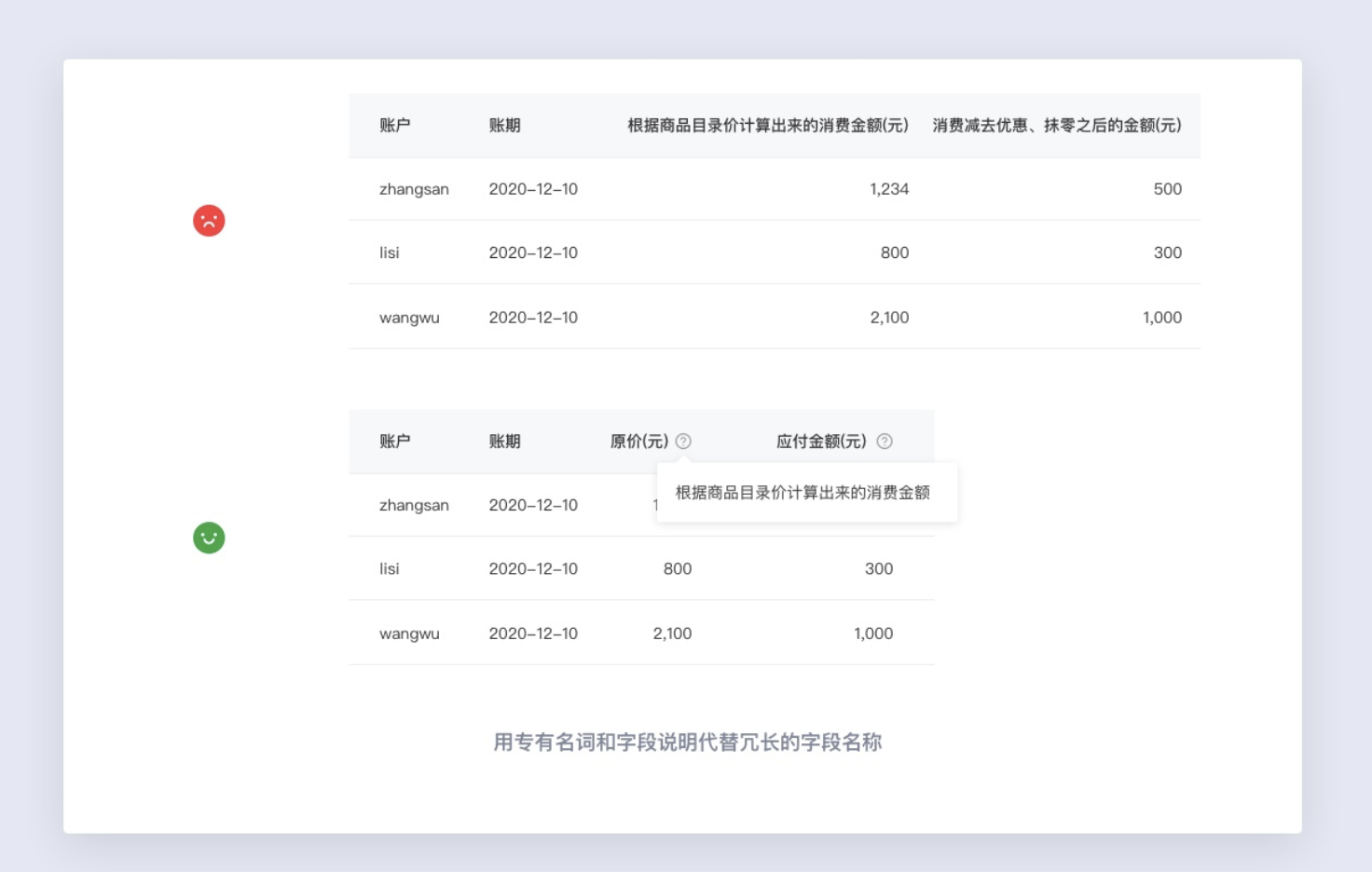 當字段名稱過長,又必須展示,才能有效的理解字段含義時。我們可以定義一個專有名詞代替,并且在字段名稱后使用添加字段說明的形式,來對字段加以說明。這樣一來用戶既可以清晰的理解字段含義,又可以在有限的頁面空間下獲取到更多的數(shù)據(jù)信息。