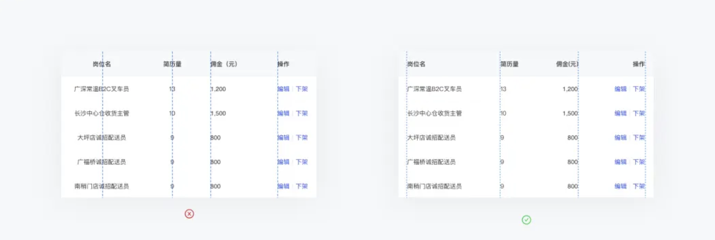 合適的對齊方式能夠提升數(shù)據(jù)的瀏覽效率。表格內(nèi)信息的縱向列對齊(符合格式塔心理學中相近原則)能夠很好的形成視覺引導線。通過對齊,會讓表格更加規(guī)范易理解,給用戶視覺上的統(tǒng)一感,視線流動更順暢,讓用戶快速的捕捉到所需內(nèi)容。
