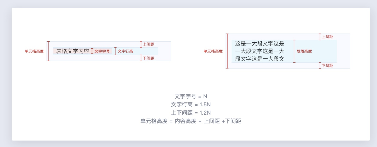 在開發(fā)同學的眼中,單元格高度=內(nèi)容高度+上間距+下間距,在實現(xiàn)設計稿時,通常也是按照這個方式來寫的,而不是像設計同學一樣按照文字的尺寸來計算間距。其中,文字行高建議設為字號的1.5倍,上下間距設為字號的1.2倍。