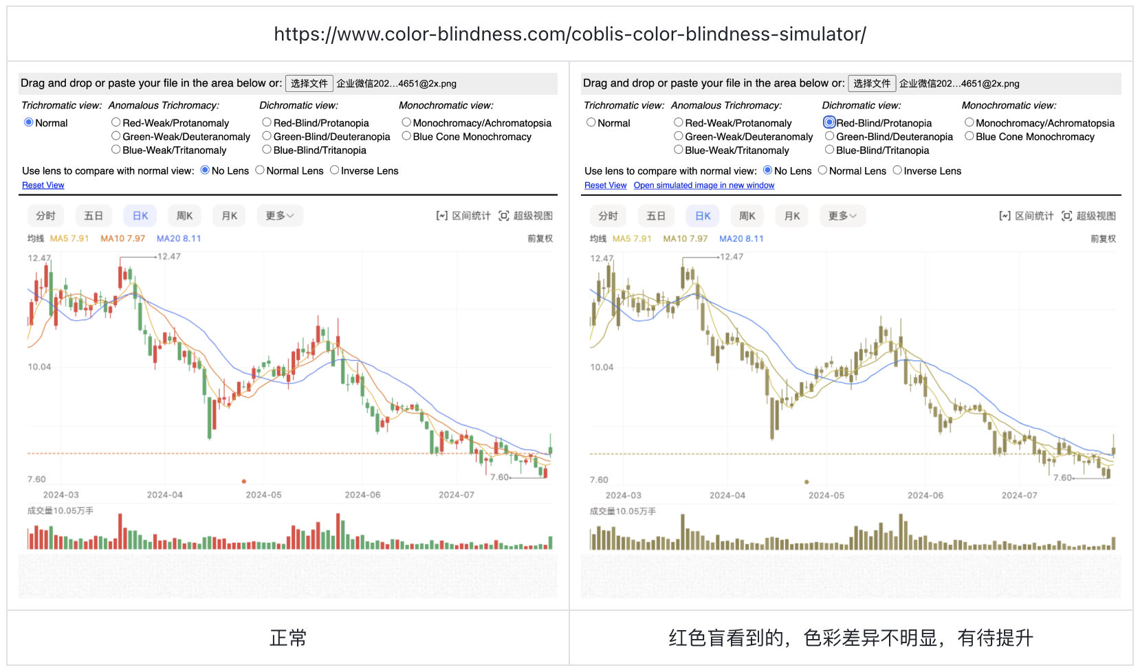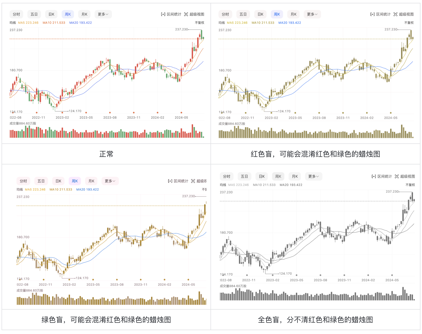 全色盲投資者更是由于只能感知明暗,在遇到這類過度依賴顏色且缺乏其他輔助元素的圖表時(shí),幾乎無法從中獲取有效的信息,難以全面理解市場(chǎng)分析的要點(diǎn)和趨勢(shì)。