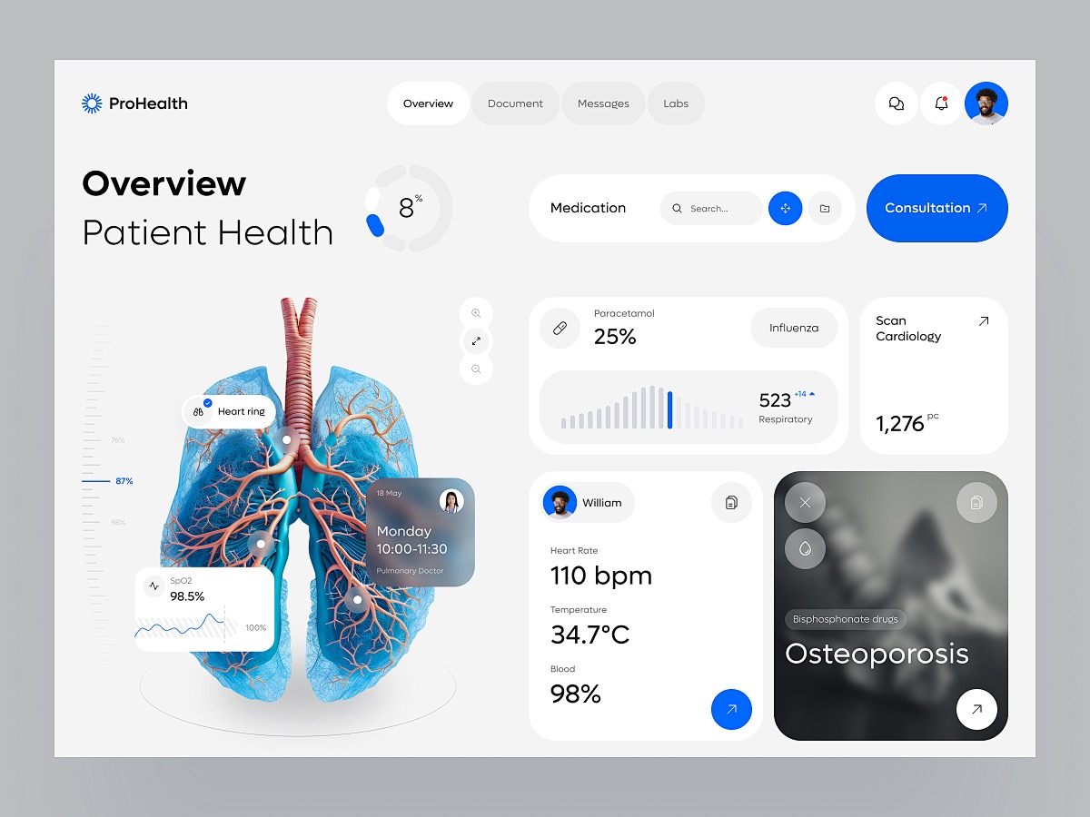 針對患者的醫(yī)療 UI 設(shè)計,功能重點在于信息查詢與服務(wù)獲取。患者需要能夠方便地查詢自己的就診記錄、檢查報告、費用明細等信息,因此在患者端的醫(yī)療 APP 或醫(yī)院官網(wǎng)界面上,應(yīng)設(shè)置專門的信息查詢?nèi)肟?,并以清晰易懂的方式呈現(xiàn)數(shù)據(jù)。同時,提供在線預(yù)約掛號、繳費、藥品配送等服務(wù)功能,實現(xiàn)就醫(yī)流程的線上化,減少患者排隊等待的時間。此外,一些健康管理功能也受到患者的歡迎,如個人健康檔案管理、疾病預(yù)防知識推送、康復(fù)訓練指導等。