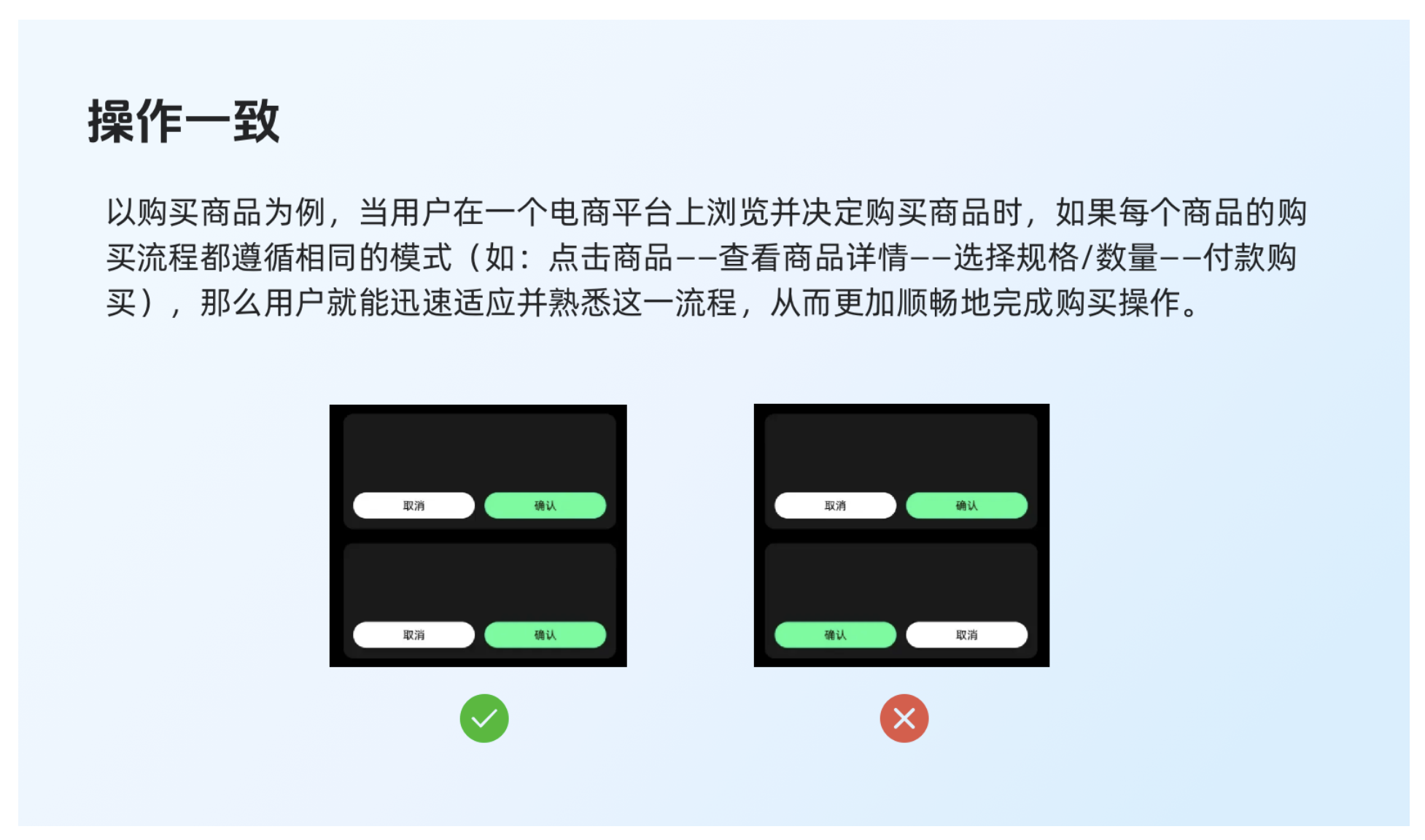 “一致性”作為規(guī)則或手段,服務(wù)于提升用戶體驗(yàn)的原則。規(guī)則與原則一致時(shí),促進(jìn)業(yè)務(wù)共識(shí)與用戶價(jià)值;沖突時(shí),原則優(yōu)先。用戶體驗(yàn)原則指導(dǎo)下的一致性,要超越表面控件統(tǒng)一,更在于產(chǎn)品決策與價(jià)值取向的一致。必要時(shí),為更好的用戶體驗(yàn),可在規(guī)則上讓步以實(shí)現(xiàn)原則統(tǒng)一。打破規(guī)則需慎重權(quán)衡,確保用戶便利足以彌補(bǔ)理解成本,需長(zhǎng)期全局考量。規(guī)則非僵化教條,而是引導(dǎo)我們謹(jǐn)慎創(chuàng)新的框架。