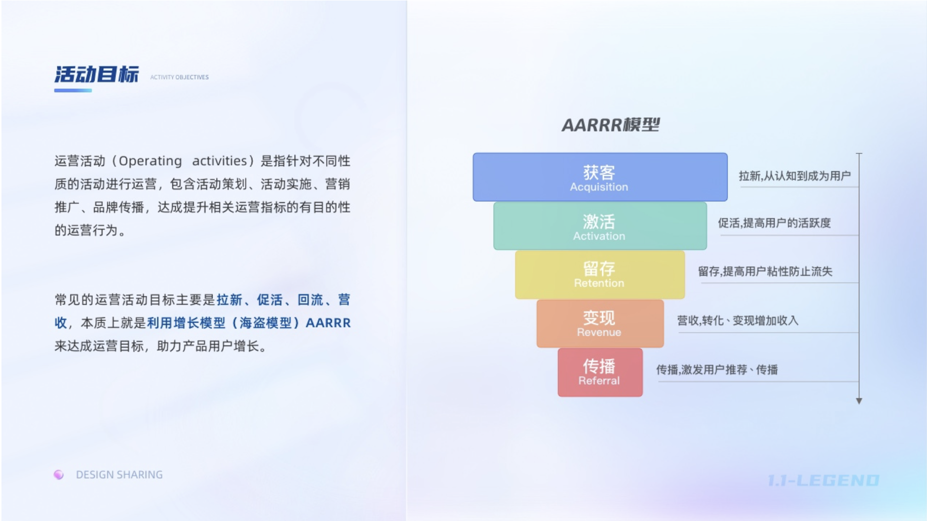 運(yùn)營活動(Operating activities)是指針對不同性質(zhì)的活動進(jìn)行運(yùn)營,包含活動策劃、活動實(shí)施、營銷推廣、品牌傳播,達(dá)成提升相關(guān)運(yùn)營指標(biāo)的有目的的運(yùn)營行為。為了更好的達(dá)成既定目標(biāo),項(xiàng)目立項(xiàng)后我們需要了解此次運(yùn)營活動的目標(biāo),以目標(biāo)展開設(shè)計策略和設(shè)計實(shí)施。常見的運(yùn)營活動目標(biāo)主要是拉新、促活、回流、營收,本質(zhì)上就是利用增長模型AARRR來達(dá)成運(yùn)營目標(biāo),助力產(chǎn)品用戶增長。