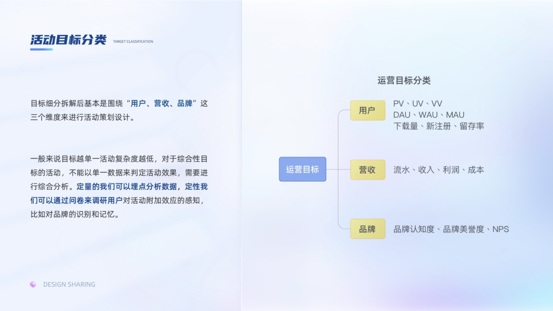 目標(biāo)的細(xì)分拆解后,基本都是圍繞“用戶、營收、品牌”這三個維度來進(jìn)行活動策劃設(shè)計。一般來說目標(biāo)越單一活動復(fù)雜度越低,目標(biāo)綜合性越高,越需要調(diào)動不同類型用戶參與,活動的復(fù)雜度就越高。對于綜合性目標(biāo)的活動,不能以單一數(shù)據(jù)來判定活動效果,需要進(jìn)行綜合分析。定量的我們可以埋點(diǎn)分析數(shù)據(jù),定性我們可以通過問卷來調(diào)研用戶對活動附加效應(yīng)的感知,比如對品牌的識別和記憶以及NPS(凈推薦值)。