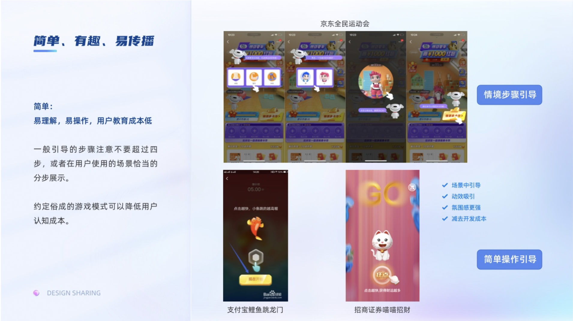 簡單:是指用戶易理解,教育成本低,操作簡單。在運(yùn)營設(shè)計中一般我們會與游戲結(jié)合,在此我稱為游戲運(yùn)營。在游戲運(yùn)營的設(shè)計中,如果不是一個約定俗成用戶都熟悉的游戲任務(wù),教育用戶如何操作的成本是相對較高的,需要有詳細(xì)的操作引導(dǎo)。一般引導(dǎo)的步驟注意不要超過四步,或者在用戶使用的場景恰當(dāng)?shù)姆植秸故尽1热珲庺~跳龍門游戲操作就比較簡單,引導(dǎo)只需要一個簡單的提示;而京東全民運(yùn)動會作為大型活動比較復(fù)雜,引導(dǎo)步驟較多,對一步分用戶來說認(rèn)知成本高就不會參與活動。