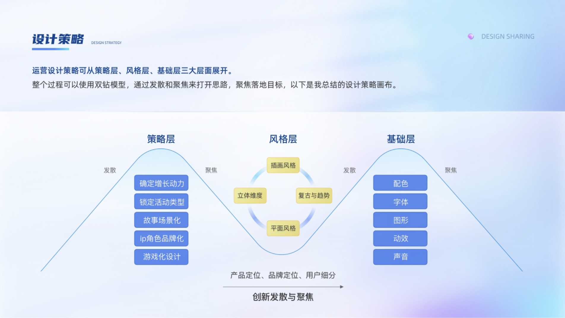 運(yùn)營設(shè)計策略可從策略層、風(fēng)格層、基礎(chǔ)層三大層面展開。整個過程可以使用雙鉆模型,通過發(fā)散和聚焦來打開思路,聚焦落地目標(biāo),以下是我總結(jié)的設(shè)計策略畫布。