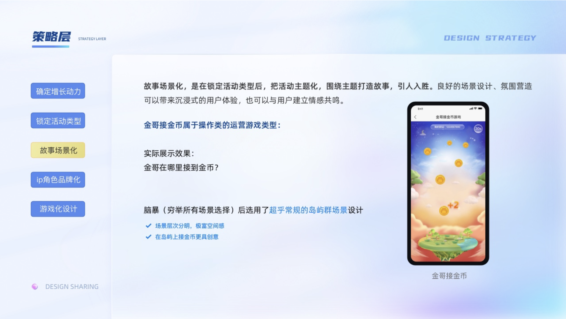 策略層:1、確定增長動力;2、鎖定活動類型;3、故事場景化;4、IP角色品牌化;5、游戲化設(shè)計