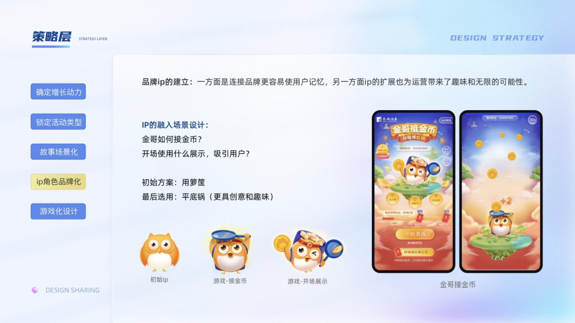 現(xiàn)在幾乎每個產(chǎn)品都有自己的ip,一方面是連接品牌更容易使用戶記憶,另一方面ip的擴(kuò)展也為運(yùn)營帶來了趣味和無限的可能性。ip的使用一是要保證ip的識別性,另一方便是需要很好的融入我們的故事場景。比如金哥他出現(xiàn)在我們接金幣的場景需要什么樣的裝束,使用什么動作更好的連接到這個接金幣的故事場景中。一開始想著用籮筐去接金幣,但是籮筐體積大而高,會擋住ip,降低了ip的識別度。在設(shè)計的過程中突然靈光一閃,為了什么不用平底鍋呢,它除了打人,接金幣也不錯。通過金哥頭頂平底鍋的接金幣方式,增添了整個游戲的創(chuàng)新性和趣味性,至于籮筐可以收納平底鍋接到的金幣,整個場景就很有邏輯性和畫面感了。同時為了凸顯游戲的氛圍,還給ip設(shè)計了頭帶必勝的綁帶的小細(xì)節(jié),和有沖擊力的動作,增添了ip的生命力。