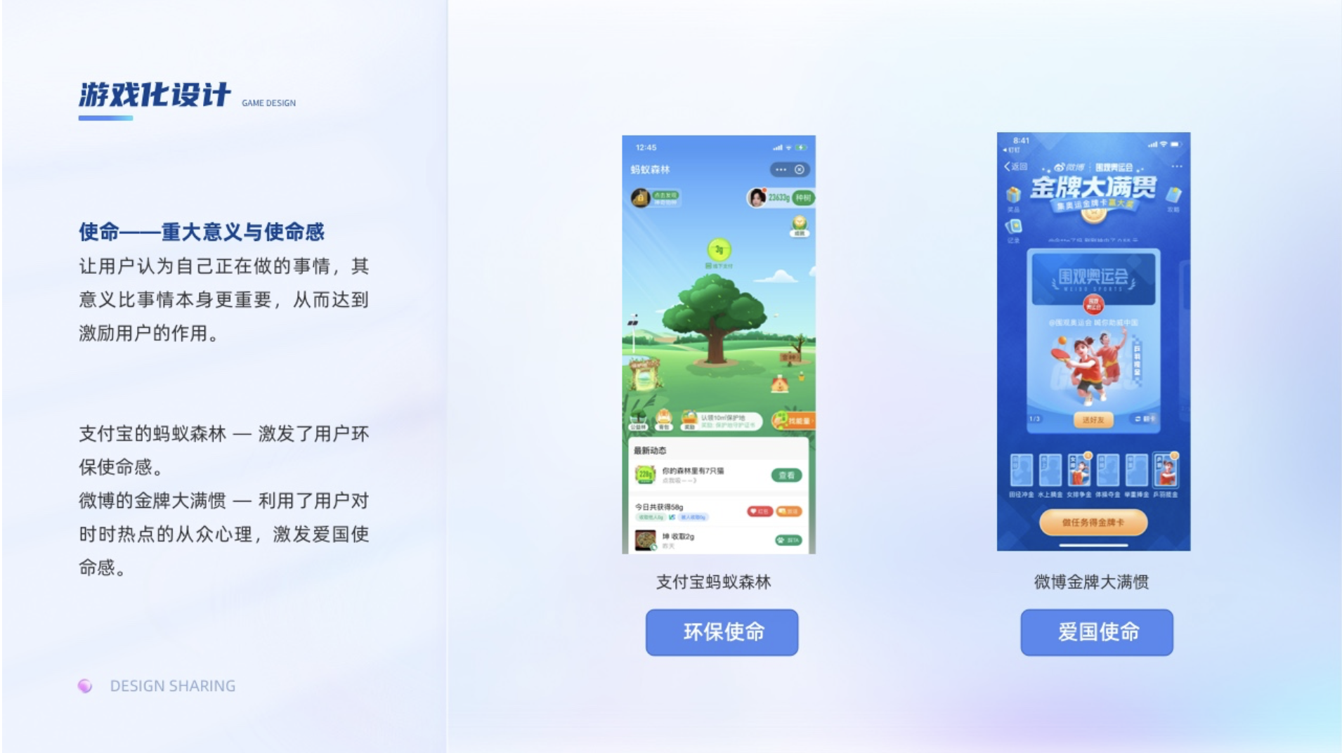 讓用戶認(rèn)為自己正在做的事情,其意義比事情本身更重要,從而達(dá)到激勵用戶的作用。譬如支付寶里面的螞蟻森林,種的不是樹,而是地球的一點(diǎn)綠,這個使命感瞬間油然而生,在玩的過程中還能幫助地球綠化,激發(fā)了用戶環(huán)保使命感。再比如在奧運(yùn)期間的微博的金牌大滿慣的活動,以圍觀奧運(yùn)會之名,集奧運(yùn)金牌卡喊你助威中國,利用了用戶對時時熱點(diǎn)的從眾心理,又聯(lián)系到了愛國上升了到了愛國使命感。