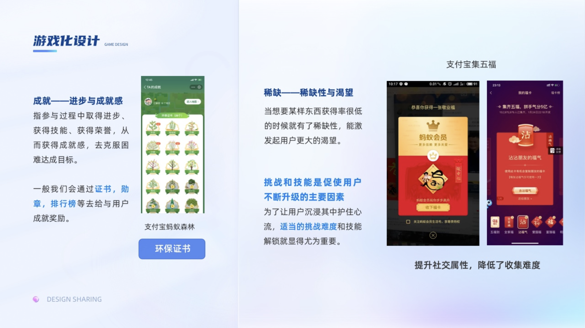 指參與過程中取得進(jìn)步、獲得技能、獲得榮譽(yù),從而獲得成就感,去克服困難達(dá)成目標(biāo)。一般我們會通過證書,勛章,排行榜等去給與用戶成就獎勵。挑戰(zhàn)和技能是促使用戶不斷升級的主要因素,為了讓用戶沉浸其中護(hù)住心流,適當(dāng)?shù)奶魬?zhàn)難度和技能解鎖就顯得尤為重要。挑戰(zhàn)難度高了容易引起用戶的焦慮,難度低了又會讓用戶感覺無聊。比如集卡行動,在考慮總預(yù)算不變的情況下,如何設(shè)置稀有卡的比例,集卡的難度就尤為重要。支付寶集五福在初期,敬業(yè)福的比例比較低,所以用戶抽到敬業(yè)福的體驗(yàn)就很開心,但隨著支付寶后面為了擴(kuò)大社交屬性,提高了集齊率,集五到五福的興奮感就弱了,導(dǎo)致部分用戶失去動力,因?yàn)榧降娜嗽蕉嗪罄m(xù)瓜分的錢就越少。