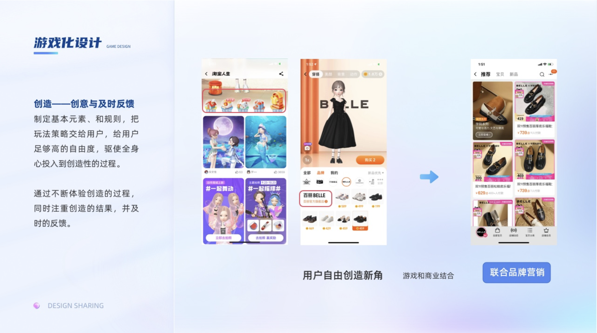 制定基本元素、和規(guī)則,把玩法策略交給用戶,給用戶足夠高的自由度,驅(qū)使全身心投入到創(chuàng)造性的過程。通過不斷體驗(yàn)創(chuàng)造的過程,同時注重創(chuàng)造的結(jié)果,并及時的反饋。比如淘寶人生,可以打造自己的形實(shí)質(zhì)上就是裝扮類的游戲,這種常駐型的游戲,不僅可以提高用戶使用產(chǎn)品的時長,還可以聯(lián)動品牌做營銷提高下單率。其生命力的不竭動力就源于,對用戶不斷提供創(chuàng)新的服裝、妝容、飾品、場景,讓用戶自由創(chuàng)造新角。