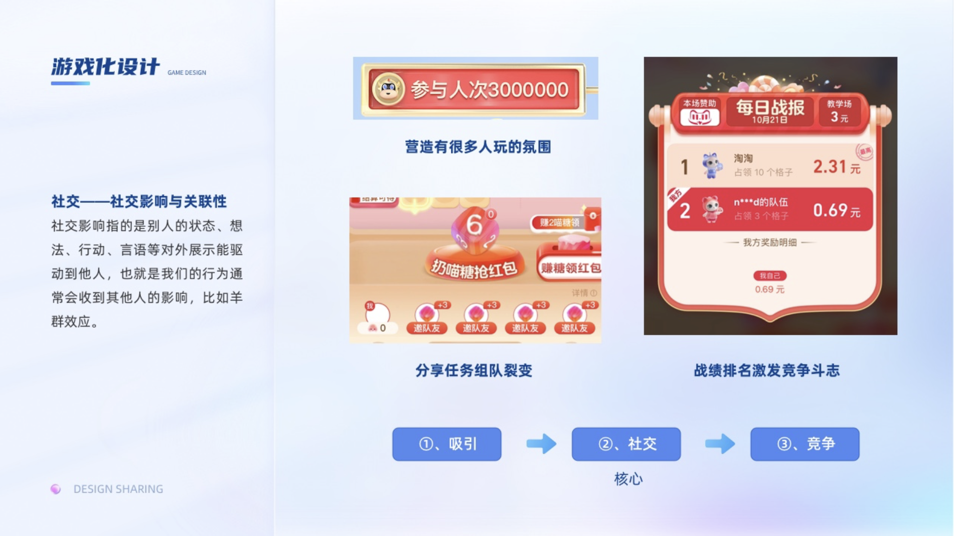 社交影響指的是別人的狀態(tài)、想法、行動、言語等對外展示能驅(qū)動到他人,也就是我們的行為通常會收到其他人的影響,比如羊群效應(yīng)。就像看抖音,點(diǎn)贊量多的,沒準(zhǔn)我們會跟有耐心看到最后,因?yàn)橛袀€潛意識心理就是大家都覺得好,總之差不到哪里去。在游戲和運(yùn)營活動中,營造有很多人玩的氛圍,鼓勵用戶炫耀自己的成果都是非常見效的方式。關(guān)聯(lián)性我理解為我們會選擇盡可能與我們有關(guān)聯(lián)的事物。比如拼多多推薦你去分享,都是優(yōu)先推薦與你互動最為頻繁的,這樣去拼單和拼單成功的幾率更高。