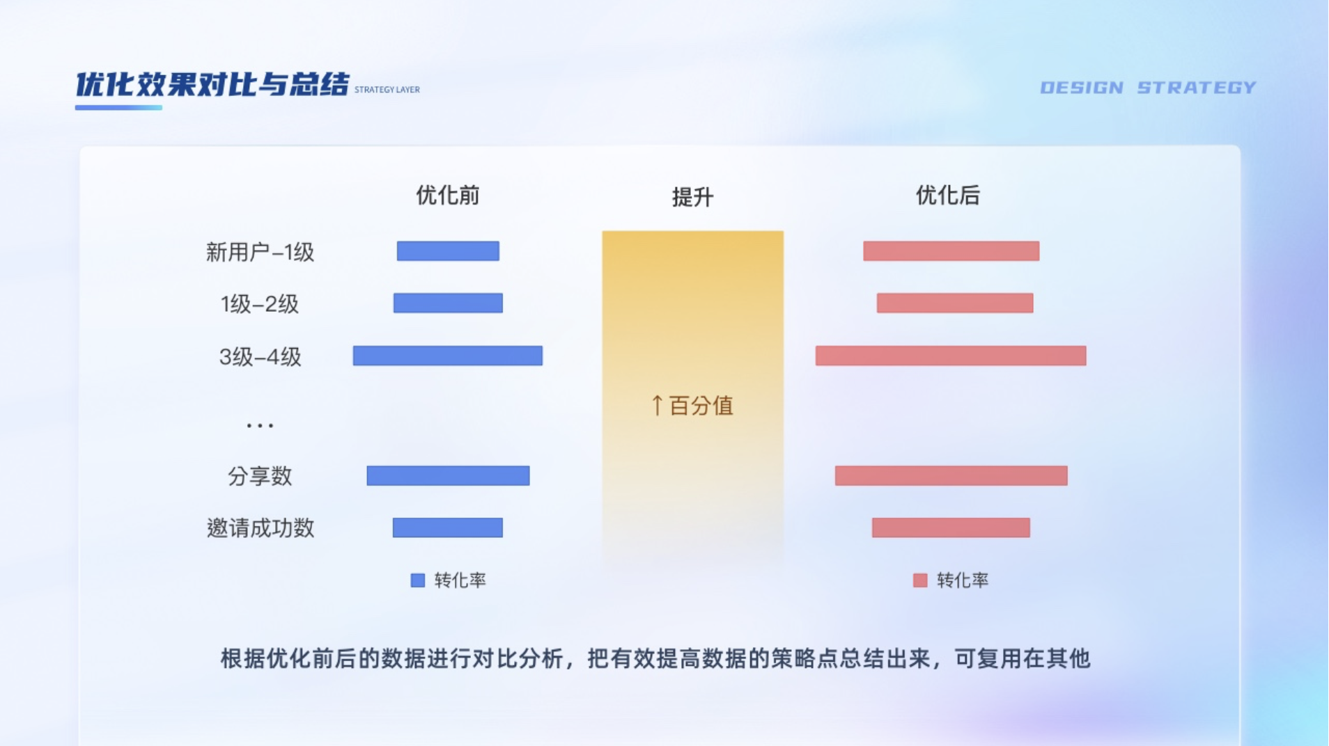 根據(jù)優(yōu)化前后的數(shù)據(jù)進(jìn)行對比分析,把有效提高數(shù)據(jù)的策略點(diǎn)總結(jié)出來,可復(fù)用在其他項(xiàng)目。