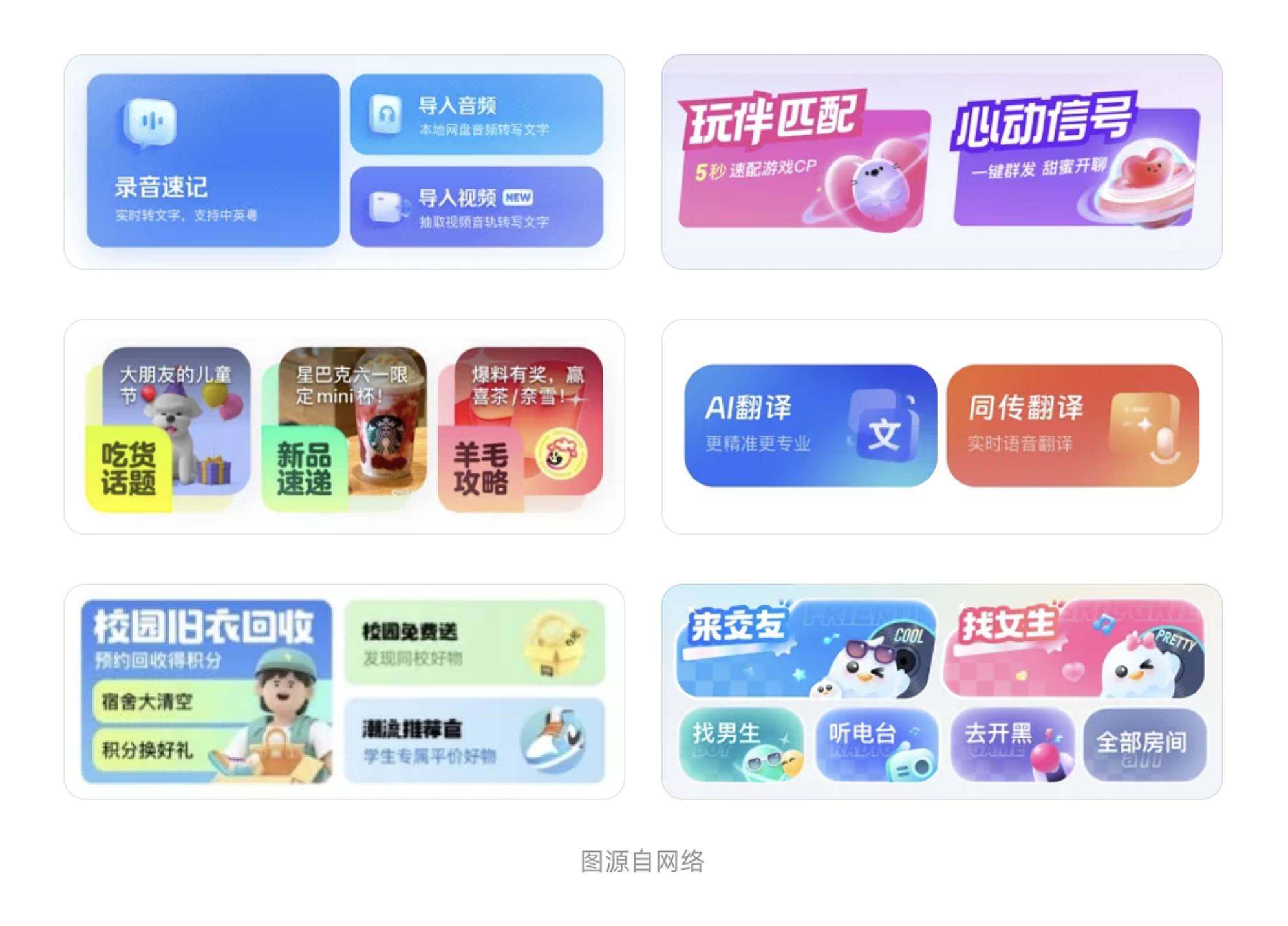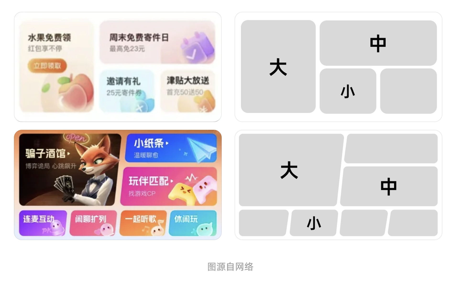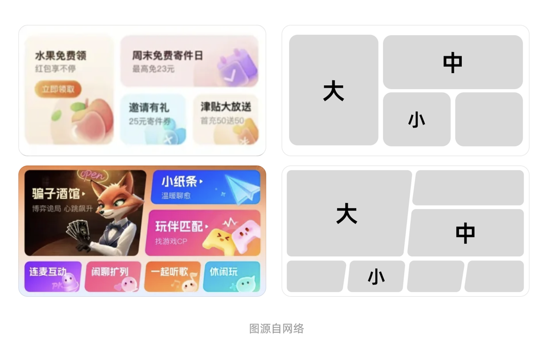 1、我們可以根據(jù)瓷片區(qū)數(shù)量靈活排版,選取1-2個(gè)核心功能放大展示,讓模塊形成“大-中-小”有節(jié)奏感的布局: