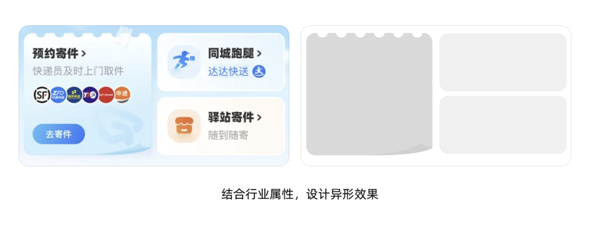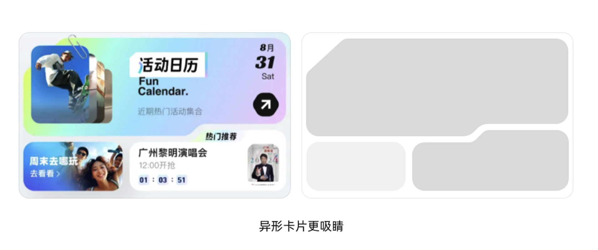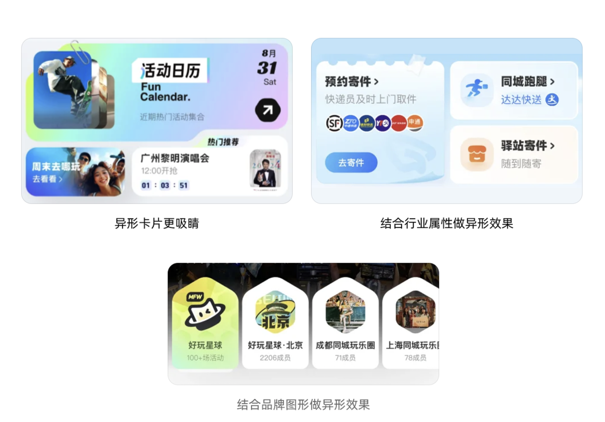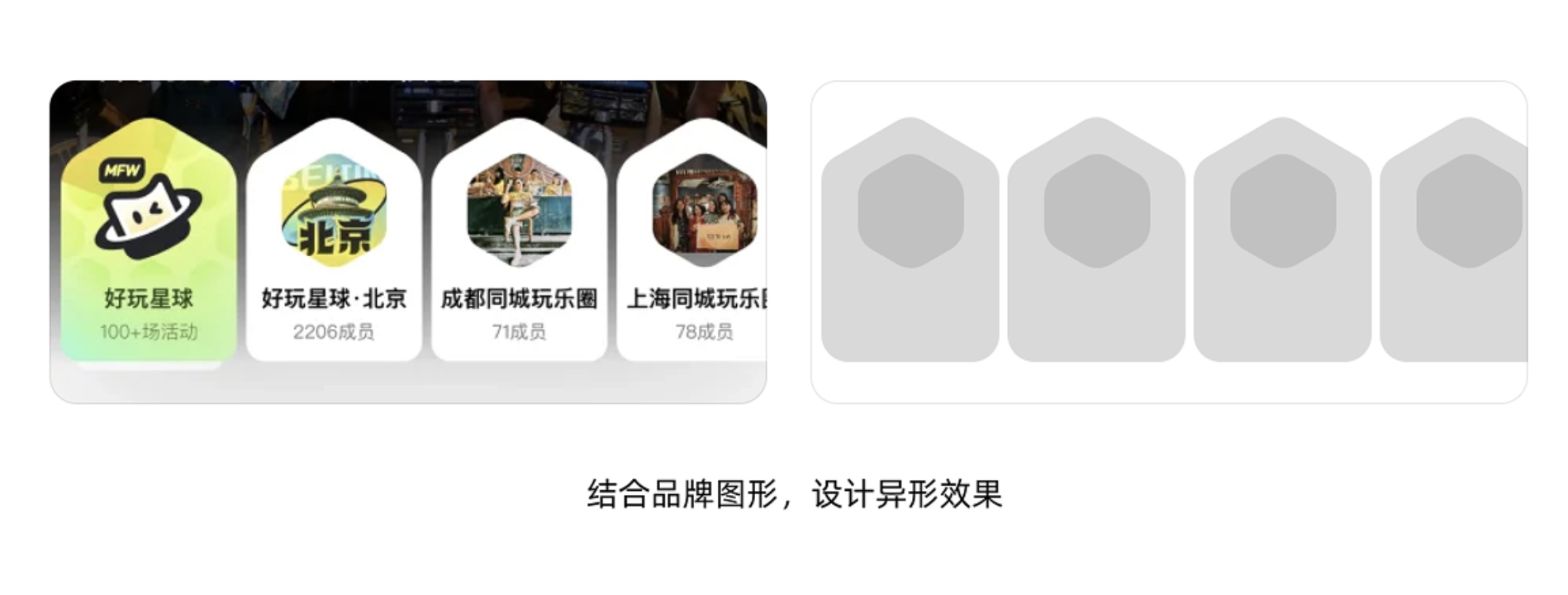 讓卡片脫穎而出的不止傾斜,我們還可以給卡片做出異形效果,用「不規(guī)則」的圖形激活用戶感官敏銳度: