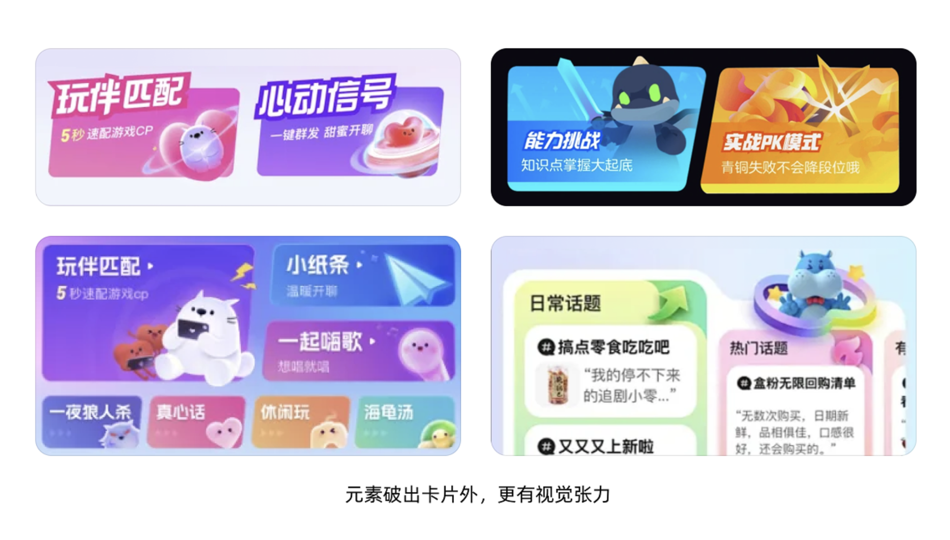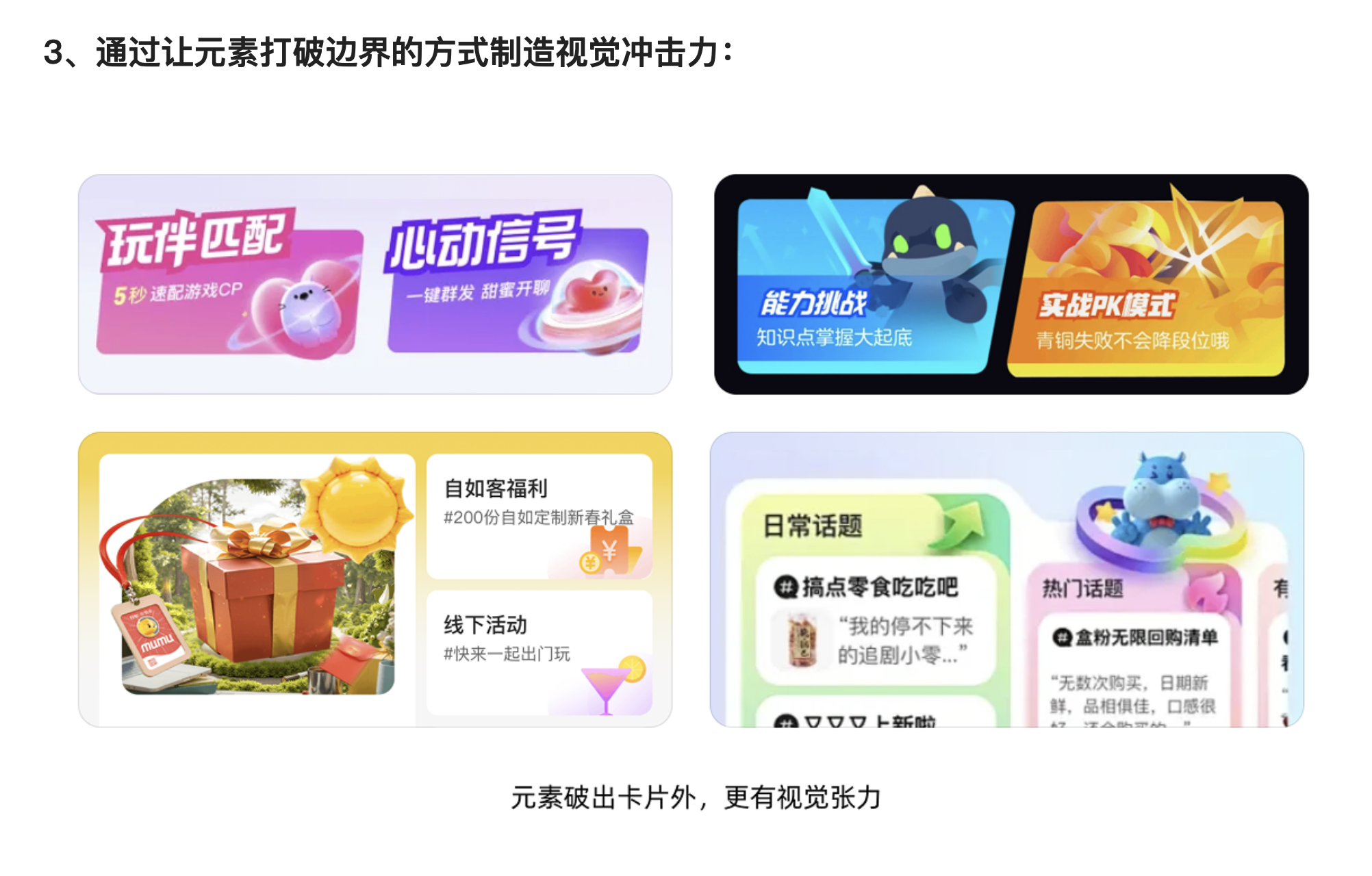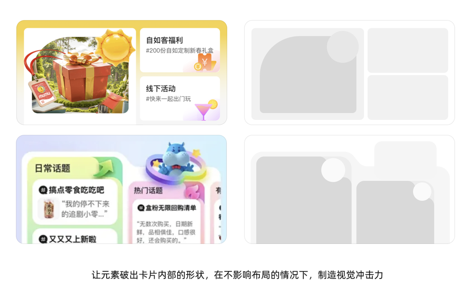 除了直接破型以外,我們還可以在卡片內(nèi)部制造形狀,讓元素突破形狀,這樣不會(huì)打破整體的布局,也能營(yíng)造視覺沖擊力: