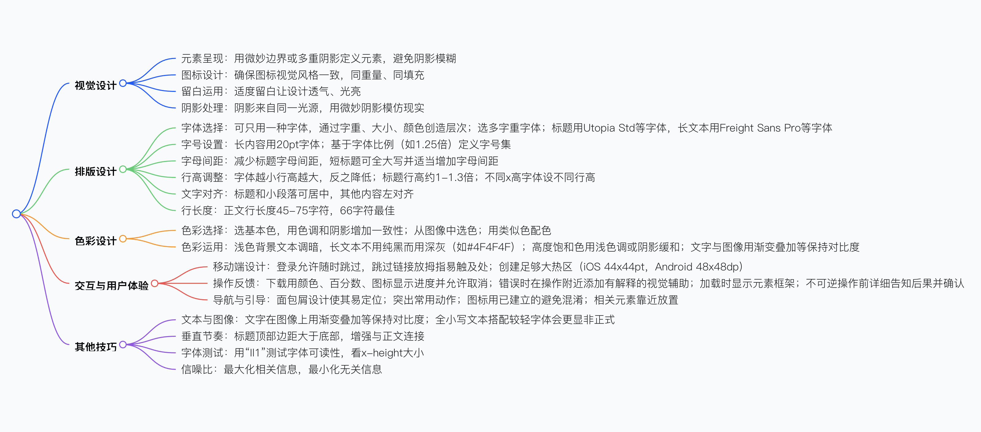 收集了 多個 UI 和 UX 設(shè)計小技巧,涵蓋視覺設(shè)計、排版、色彩、交互等多方面,包括通過微妙邊界或多重陰影讓元素更清晰、減少標(biāo)題字母間距以實(shí)現(xiàn)視覺平衡、確保圖標(biāo)風(fēng)格一致、適當(dāng)留白使設(shè)計更透氣、20pt 字體提升長文本閱讀體驗(yàn)、基于字體比例定義字號集、選擇基本色并通過色調(diào)和陰影增加一致性、移動端登錄允許用戶隨時跳過并將跳過鏈接放在拇指易觸及位置、確保陰影來自同一光源、合理進(jìn)行圖層管理、通過色彩對比度等突出重要元素、錯誤時添加視覺輔助、移動端創(chuàng)建足夠大熱區(qū)、保持文字與圖像對比度等,這些技巧能通過最小調(diào)整改善設(shè)計細(xì)節(jié)和用戶體驗(yàn)。