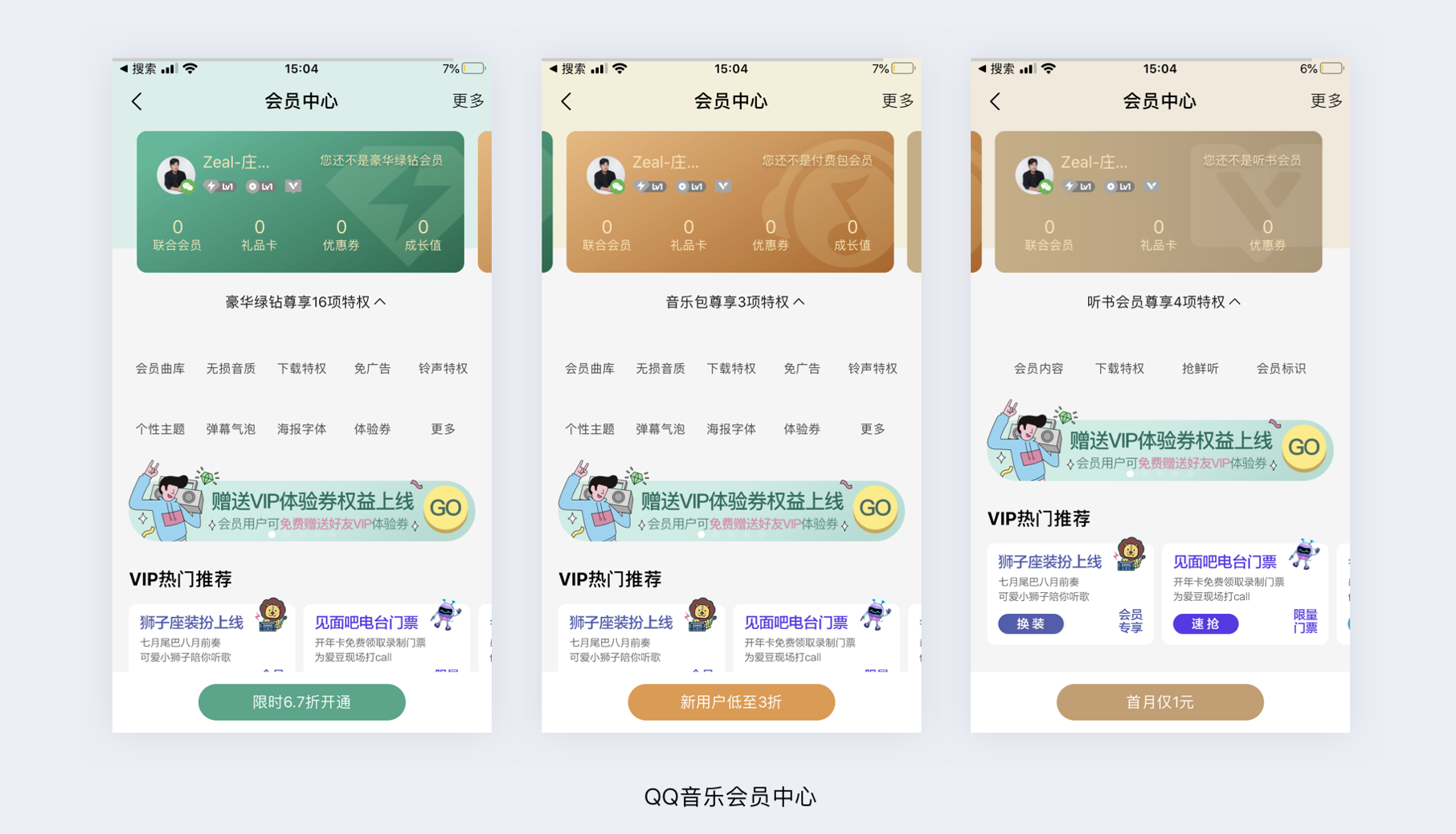 - 圖版率與視覺比重:通過顏色填充背景改變界面專屬比重,引導(dǎo)視覺,如 QQ 音樂會(huì)員中心不同等級對應(yīng)不同顏色 card。