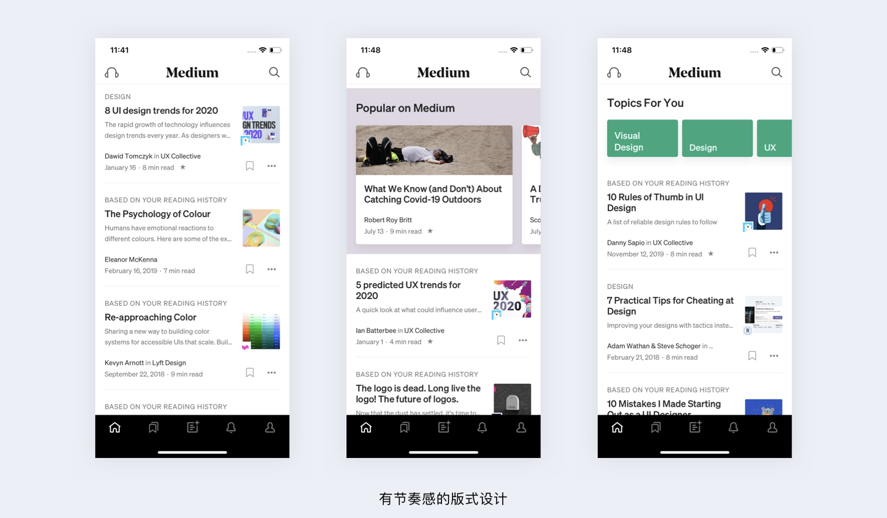 - 節(jié)奏感設(shè)計(jì):在統(tǒng)一樣式中穿插不同模塊,如 Medium、網(wǎng)易云音樂的版式設(shè)計(jì)。