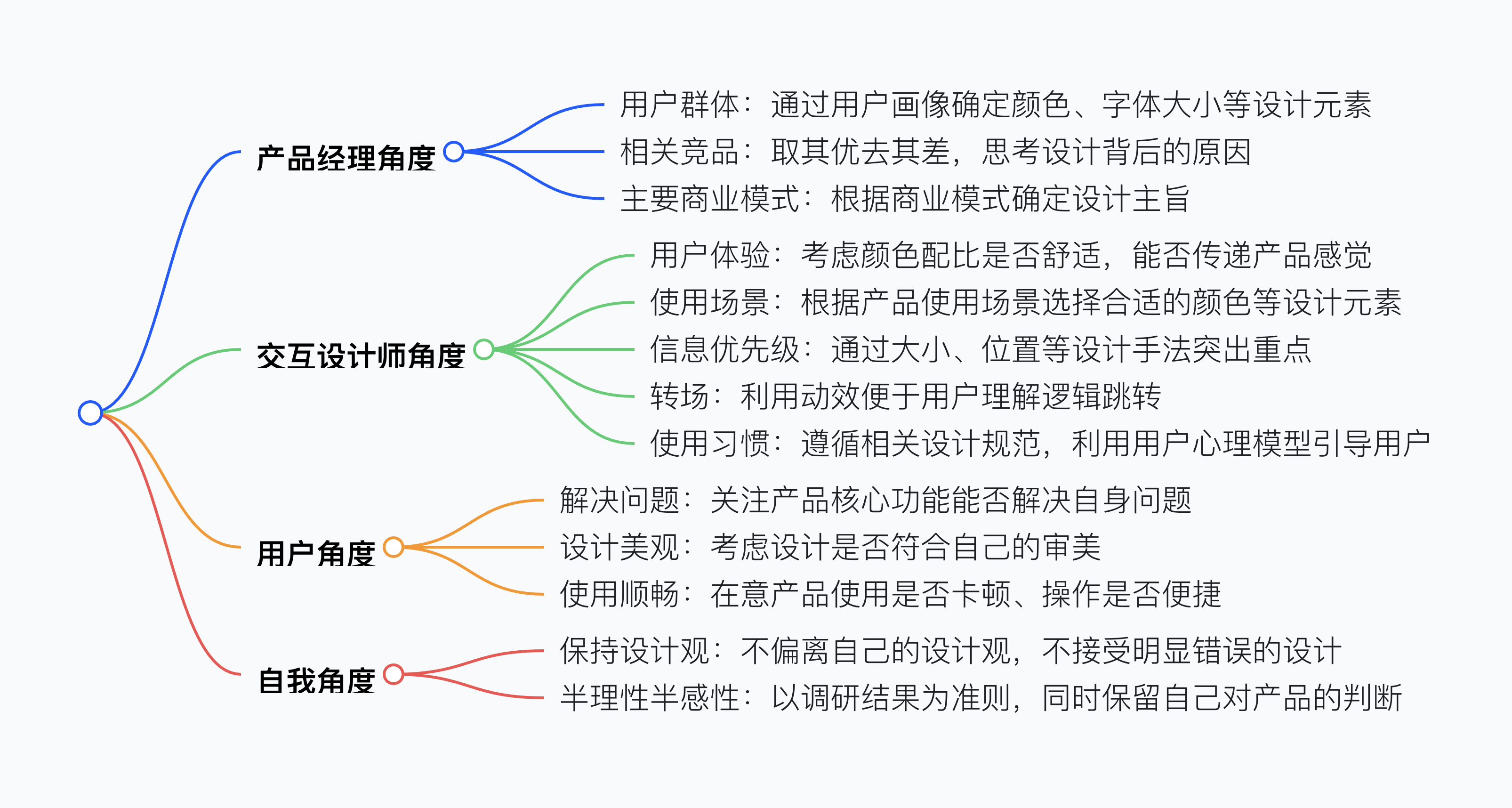 UI 設(shè)計需從產(chǎn)品經(jīng)理、交互設(shè)計師、用戶和自我這 4 個角度思考:像產(chǎn)品經(jīng)理一樣關(guān)注用戶群體、相關(guān)競品、主要商業(yè)模式;像交互設(shè)計師一樣考慮用戶體驗、使用場景、信息優(yōu)先級、轉(zhuǎn)場、使用習(xí)慣;像用戶一樣思考產(chǎn)品能否解決問題、設(shè)計是否美觀、使用是否順暢;像自己一樣保持設(shè)計觀,不盲目接受錯誤設(shè)計。如此才能做出符合用戶需求且有自己韻味的設(shè)計。