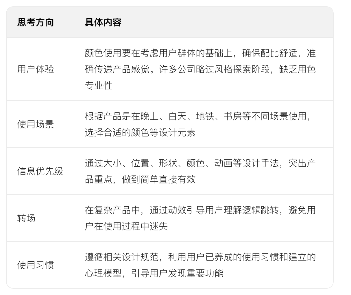 - 答案:交互設(shè)計師角度的思考包括用戶體驗、使用場景、信息優(yōu)先級、轉(zhuǎn)場、使用習(xí)慣等方面。在用戶體驗上,影響顏色配比的舒適性和對產(chǎn)品感覺的傳遞;在使用場景上,決定設(shè)計元素是否符合產(chǎn)品使用環(huán)境;在信息優(yōu)先級上,指導(dǎo)如何通過設(shè)計手法突出重點;在轉(zhuǎn)場上,幫助用戶理解邏輯跳轉(zhuǎn);在使用習(xí)慣上,利用用戶心理模型引導(dǎo)操作,這些都能提升 UI 設(shè)計的實用性和用戶體驗。