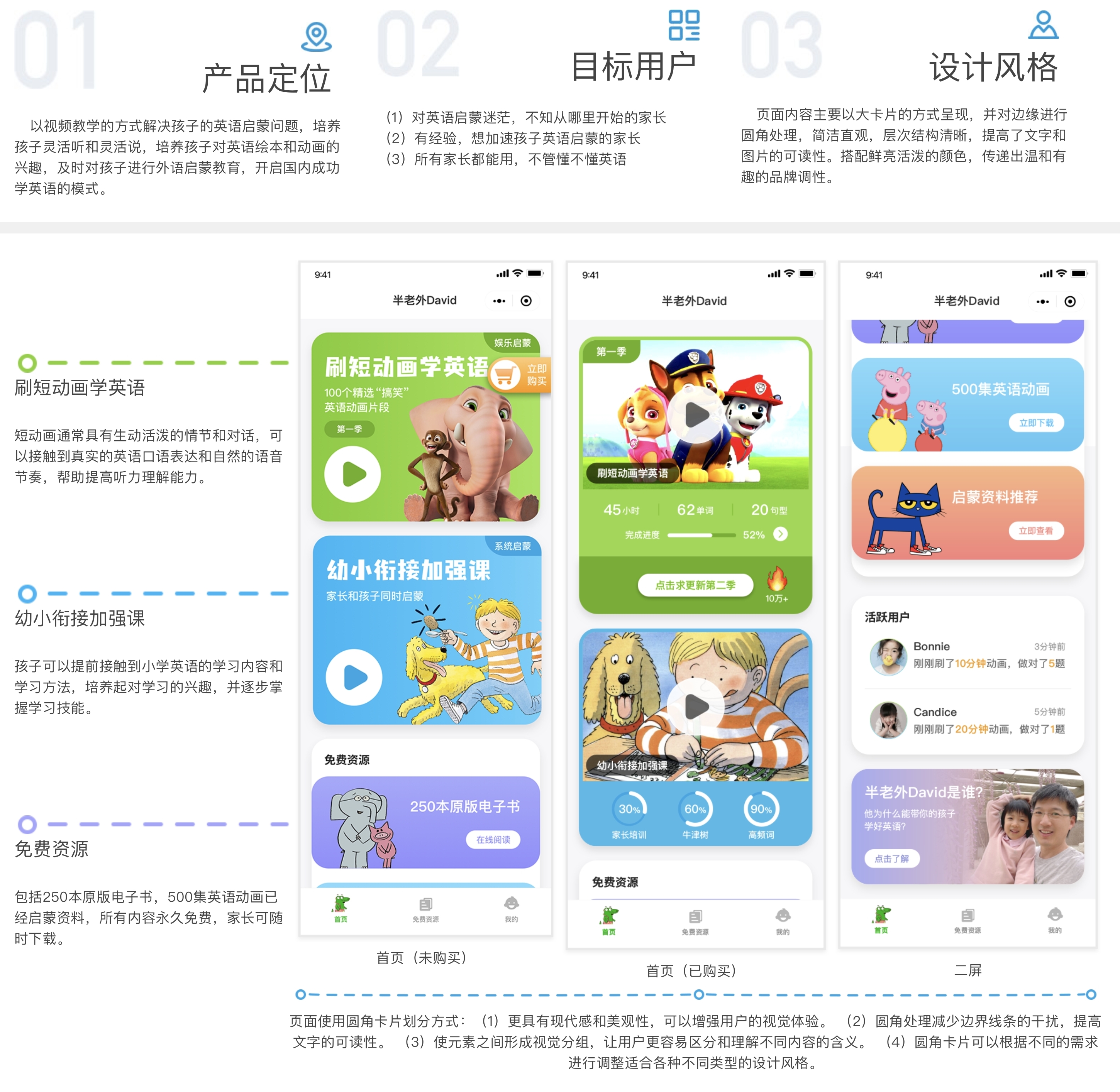 舉例來(lái)說(shuō),我們?cè)鵀橐粋€(gè)名為“半老外 David 英語(yǔ)啟蒙”小程序參與界面與交互設(shè)計(jì)。在這個(gè)面向兒童與家長(zhǎng)的英語(yǔ)學(xué)習(xí)產(chǎn)品中,為了提高用戶(hù)體驗(yàn)我們進(jìn)行視覺(jué)調(diào)整: