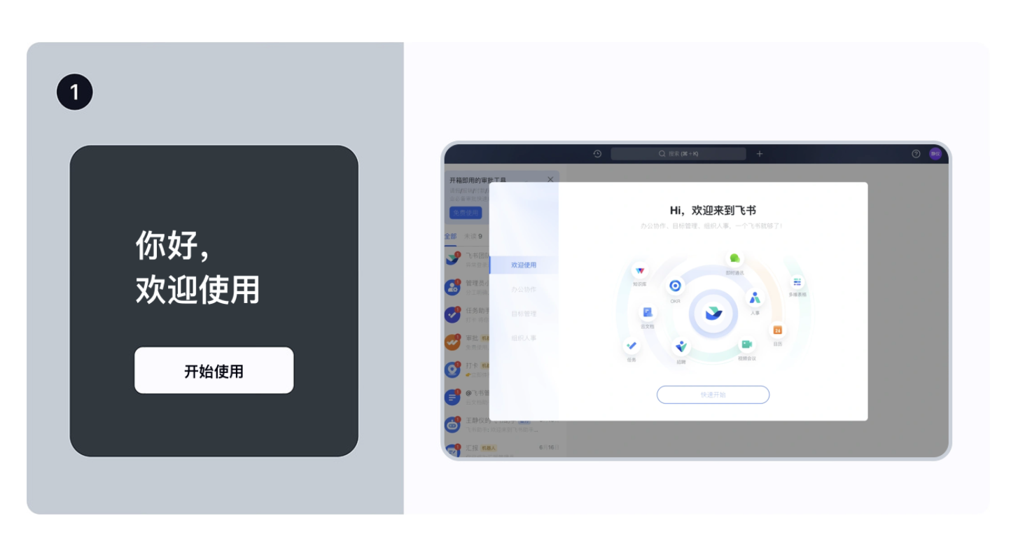 - 例子:飛書(shū)的歡迎頁(yè)會(huì)直接告訴用戶 “這里有辦公協(xié)作、云文檔、審批等功能”,既點(diǎn)明核心價(jià)值,又定下專業(yè)的辦公氛圍;
