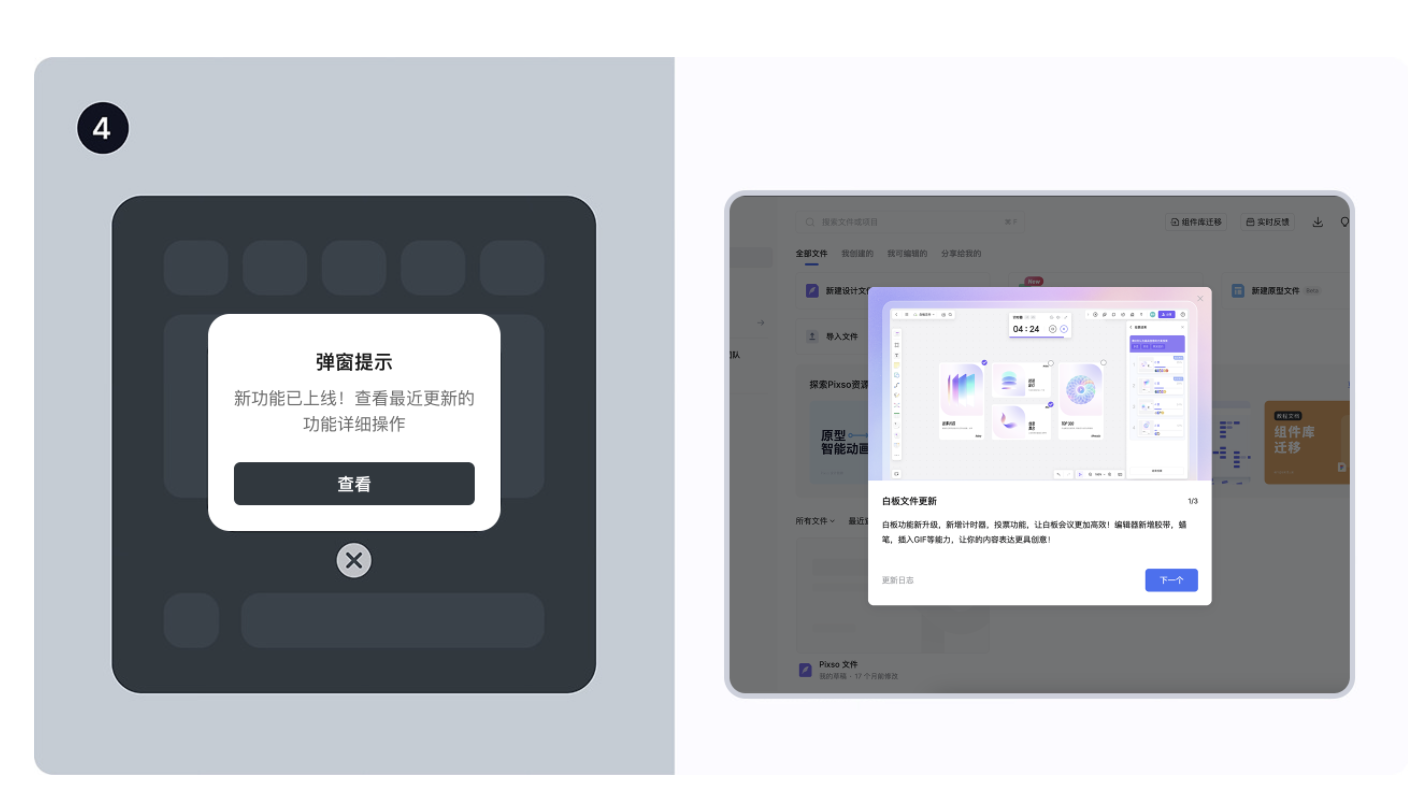 - 例子:Pixso 更新白板功能后,用彈窗提示 “新增計(jì)時(shí)器、投票功能”,用戶看完能直接點(diǎn) “查看” 或 “關(guān)閉”;