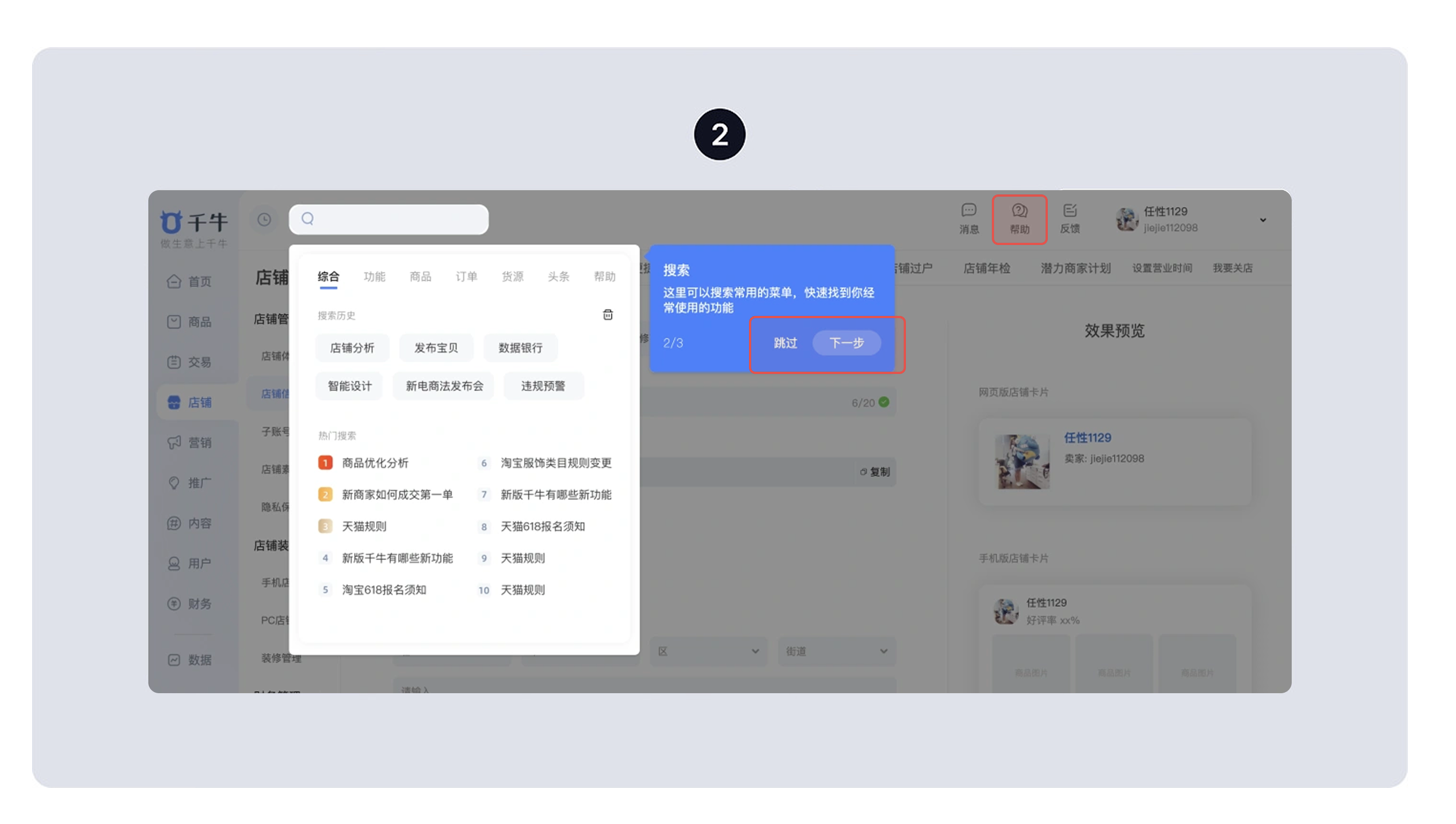 - 例子:千牛 APP 的新手引導(dǎo)會(huì)提示 “這里能搜索常用功能”,用戶可以點(diǎn) “下一步” 繼續(xù)看,也能直接點(diǎn) “跳過(guò)”;Notion 沒(méi)有強(qiáng)制引導(dǎo),而是單獨(dú)做了 “幫助頁(yè)面”,用戶有問(wèn)題再去查;