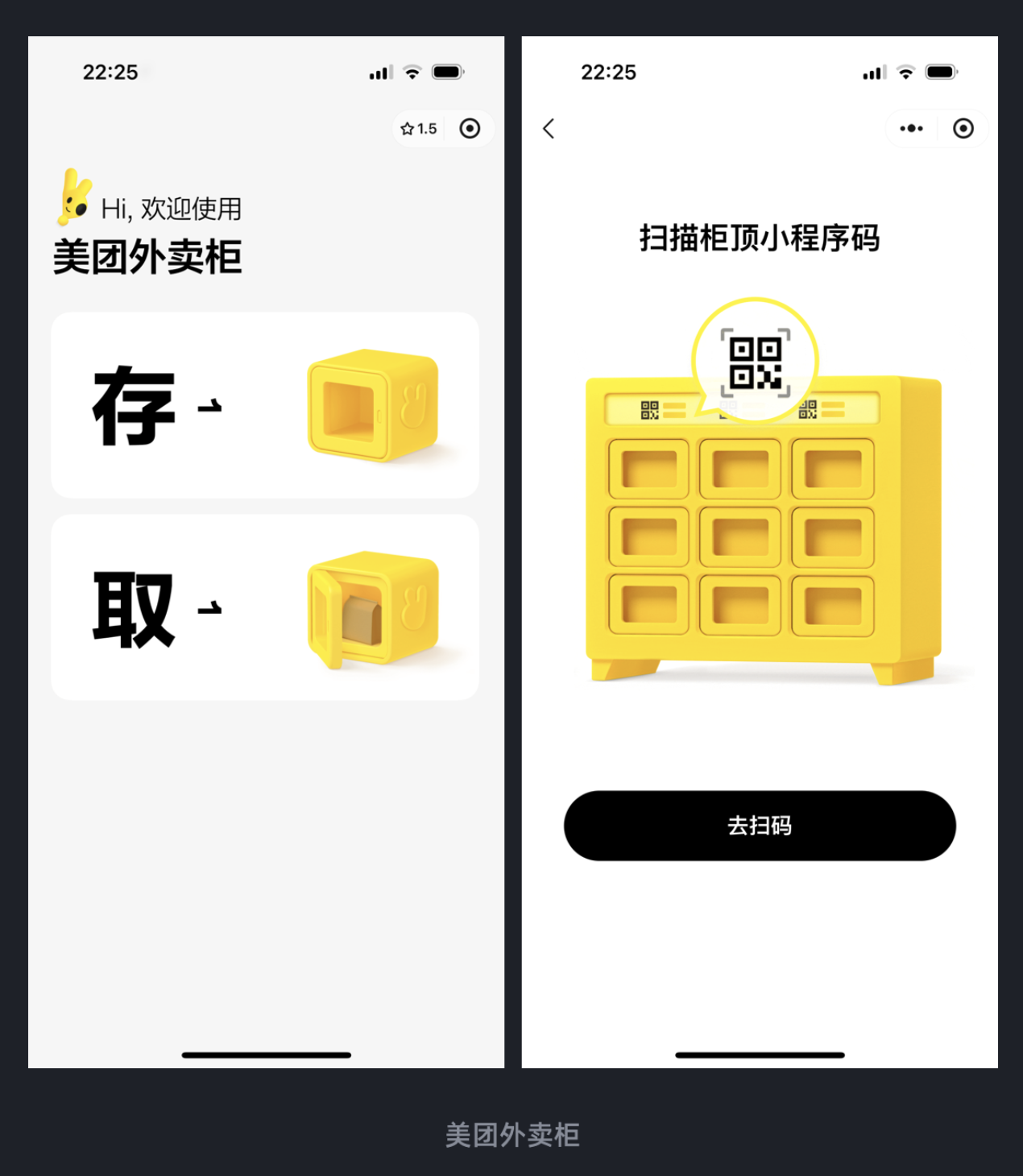 美團(tuán)外賣柜小程序卻反其道而行之 —— 打開界面后,只有 “存” 和 “取” 兩個核心按鈕,搭配 “掃描柜頂小程序碼” 的簡單指引,沒有任何廣告、推薦等多余元素。