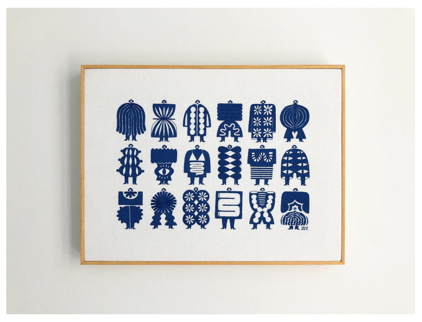 當(dāng)一根緞面繡線在棉布上蜿蜒,勾勒出娃娃領(lǐng)的弧度;當(dāng)幾何色塊與鮮艷針腳碰撞,撐起一件迷你裙擺 —— 印尼藝術(shù)家 Irene Saputra(藝名 Nengiren)正用最傳統(tǒng)的刺繡工藝,做著最時髦的 “角色穿搭實驗”。她筆下的 “nona kecil”(印尼語 “小女孩”)系列,不是靜態(tài)的玩偶,而是每天都有新造型的 “時尚 Icon”,在針與線的交錯間,完成了手工藝與現(xiàn)代時尚的溫柔對話。