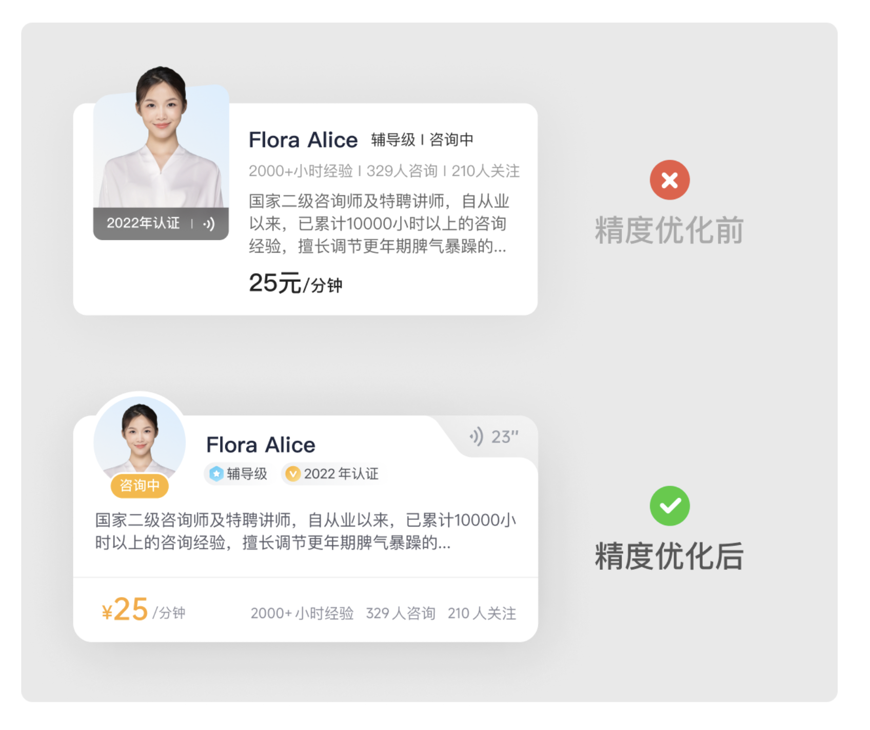 卡片中的關鍵數(shù)據(jù)(如咨詢費用、經(jīng)驗時長、咨詢?nèi)藬?shù))需要重點突出,但要避免多個視覺焦點沖突??蓪①M用 “25 元 / 分鐘” 改為 “¥25 / 分鐘”,放大字號并加粗;其他數(shù)據(jù)保持統(tǒng)一字號,用間距區(qū)分,讓用戶一眼就能捕捉到核心信息,提升決策效率。