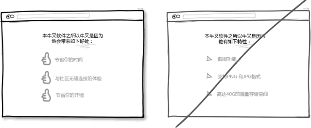 市場就是這樣的,用戶永遠(yuǎn)只關(guān)心自身利益而產(chǎn)品特性對他們來說倒不是那么重要。只有利益才更直觀地體現(xiàn)出使用產(chǎn)品所帶來的價值。Chris Guillebeau在他的著作《100美元起家》中指出,相比壓力,沖突,煩心事和未知的未來,人們在乎得更多的是愛,金錢,認(rèn)同感和自由支配的空閑時間。所以我相信在展示產(chǎn)品特性時回歸到利益上是必要的。
