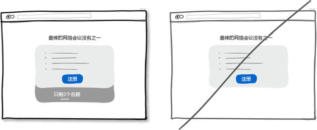 適當(dāng)?shù)木o迫感是個有效的戰(zhàn)術(shù)可以讓用戶立即做出決定而不是等上個十天半個月。重要的是這種戰(zhàn)術(shù)屢試不爽,因為它暗示了資源的緊缺或者活動的時間有限,今天可以買,但明天可能就無法這么低價了。另一方面,這一戰(zhàn)術(shù)也讓用戶感到會錯失一次大好的機會,再一次,應(yīng)用了人們害怕失去的本性。當(dāng)然,這種戰(zhàn)術(shù)會被一些人嗤之以鼻,認(rèn)為是不耿直的做法。不過,這只是種戰(zhàn)術(shù)而以,并且在保持合法性的前提下應(yīng)用也無傷大雅。所以請不要為了營銷而在界面上制造緊迫的假象。