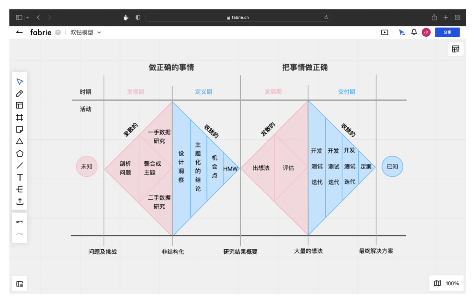 雙鉆模型是設(shè)計(jì)思維的核心框架,分為發(fā)現(xiàn)期、定義期、發(fā)展期、交付期四個(gè)階段,通過(guò) “發(fā)散 - 收攏” 的循環(huán)確保設(shè)計(jì)方向正確且執(zhí)行到位。但很多設(shè)計(jì)師因缺乏工具支撐,難以完整踐行這一流程。
