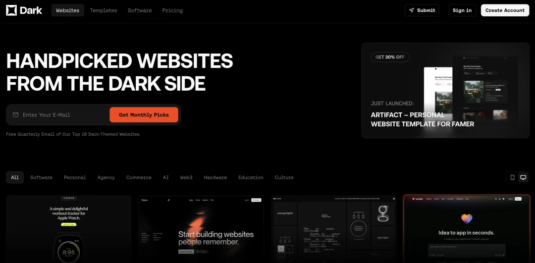 Dark Design 不僅提供整體網(wǎng)站設(shè)計(jì)靈感,還關(guān)注暗色模式下的細(xì)節(jié)處理,如色彩對(duì)比、可讀性和視覺層次,是設(shè)計(jì)暗色界面的絕佳參考資源。