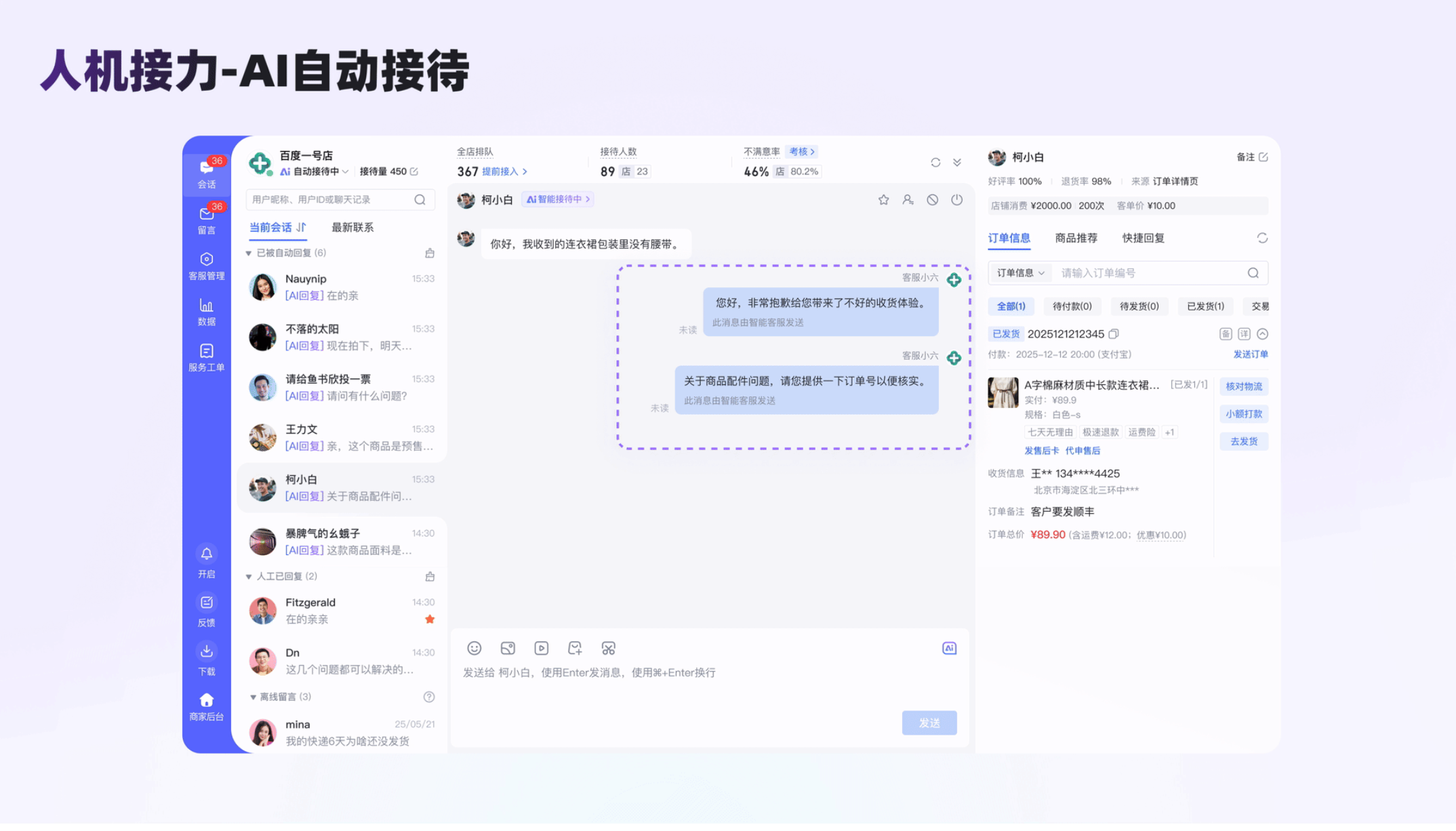 相較于嵌入式、伴隨式交互需商家實(shí)時參與、無法解放人力的特點(diǎn),托管式交互通過 **“預(yù)先配置規(guī)則,系統(tǒng)自動執(zhí)行”** 實(shí)現(xiàn)最高程度的自動化,核心適配客服接待等需規(guī)模化服務(wù)的場景。針對商家對 AI 自動化 “黑盒操作回復(fù)” 的不信任,以及人工無法實(shí)現(xiàn) 24 小時不間斷接待、難以覆蓋海量咨詢需求的問題,我們設(shè)計了 “預(yù)先配置 + 人機(jī)接力” 的托管式交互方案,讓 AI 成為可自主運(yùn)行的安心服務(wù)管家。